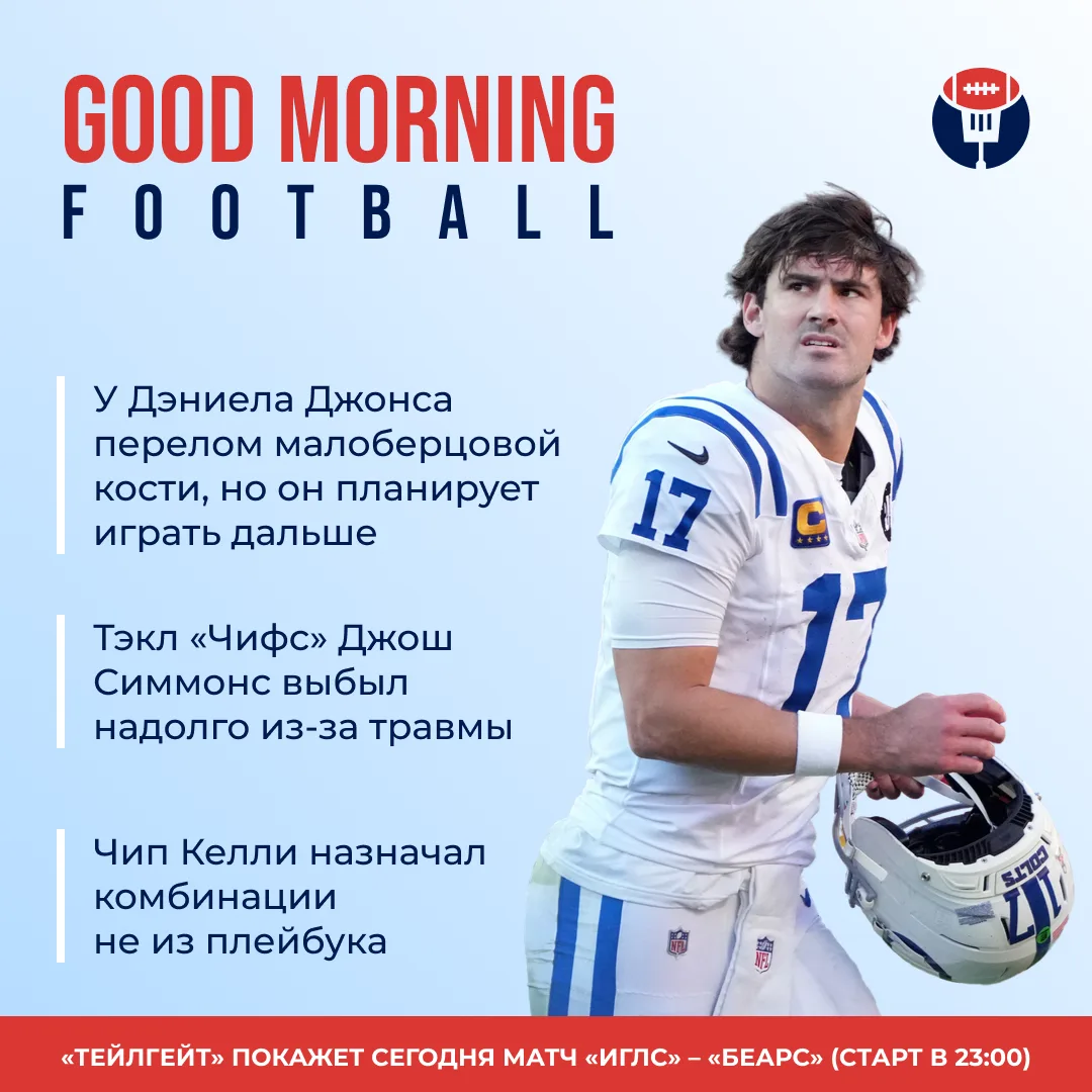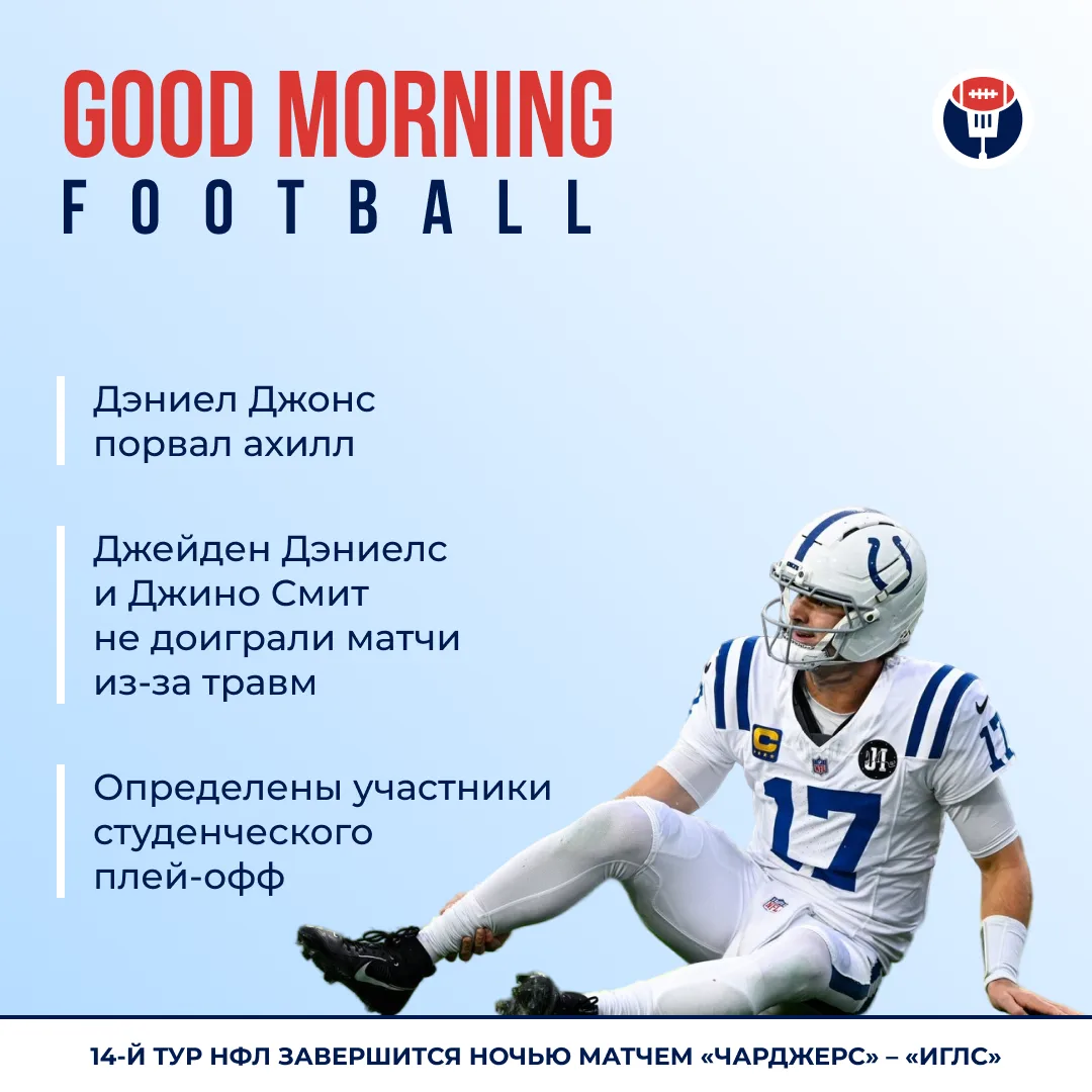 😨 Квотербек «Индианаполиса» Дэниел Джонс порвал ахилл в матче с «Джексонвиллом». Вместо него матч доигрывал новичок из шестого раунда Райли Леонард. Учитывая, что Энтони Ричардсон всё ещё находится в резерве для травмированных, в случае травмы Леонарда за центра пришлось бы вставать тайт-энду Тайлеру Уоррену — он был квотербеком в старших классах школы и периодически получал пасовые снэпы в колледже. «Колтс» наверняка поднимут из тренировочного состава Бретта Рипена или же подпишут кого-то ещё.
