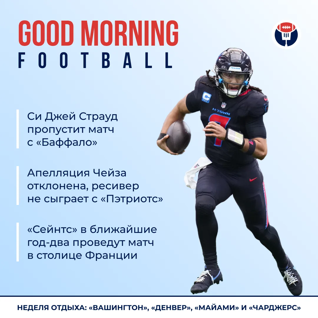 🤕 Квотербек «Хьюстона» Си Джей Страуд пропустит матч с «Джексонвиллом» из-за сотрясения мозга. Вместо него на поле выйдет дублёр Дэвис Миллс.