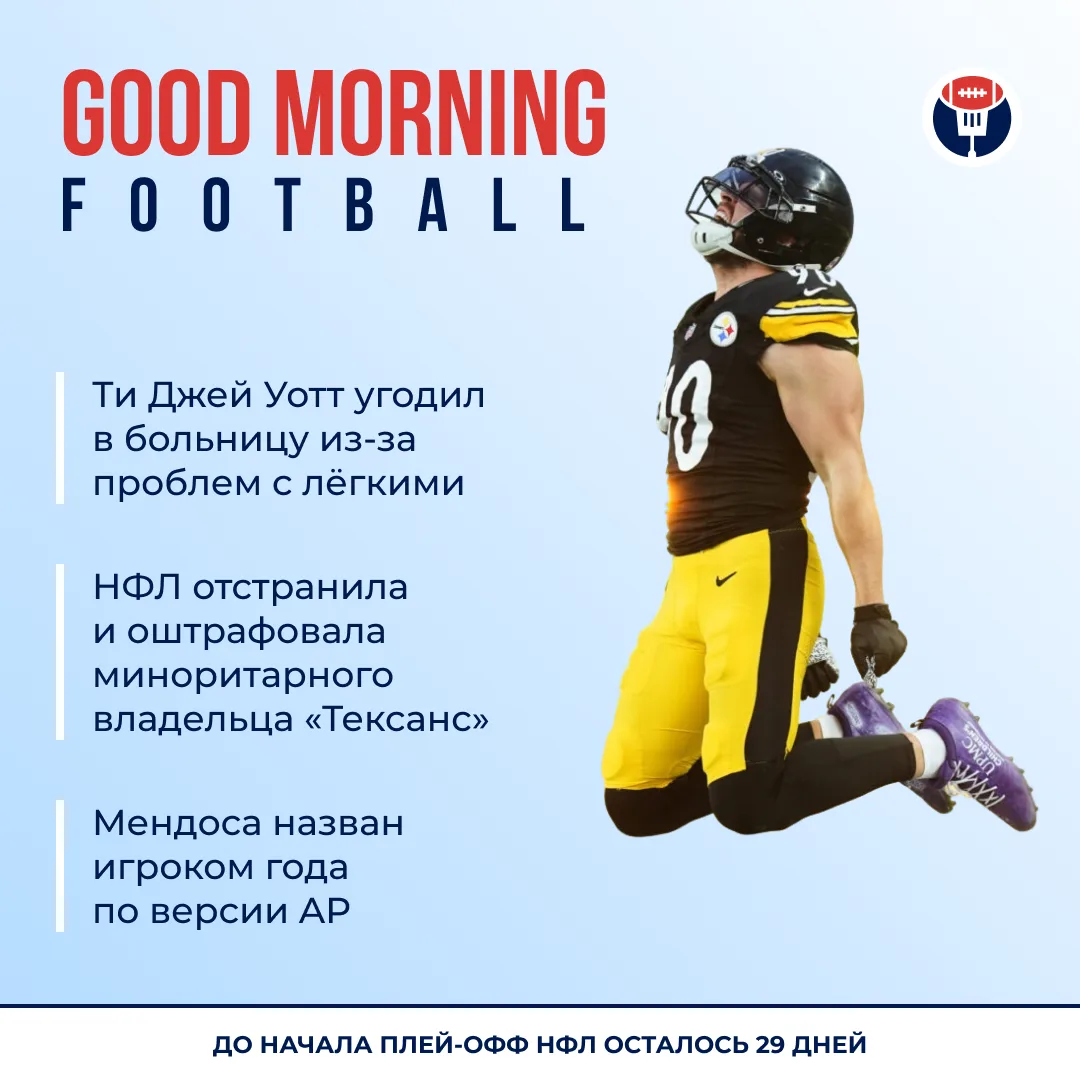 🏥 Эдж-рашер «Питтсбурга» Ти Джей Уотт оказался в больнице из-за дискомфорта в лёгких. В тренировке вчера он участия не принимал, участие защитника в ближайшей игре с «Майами» под вопросом.