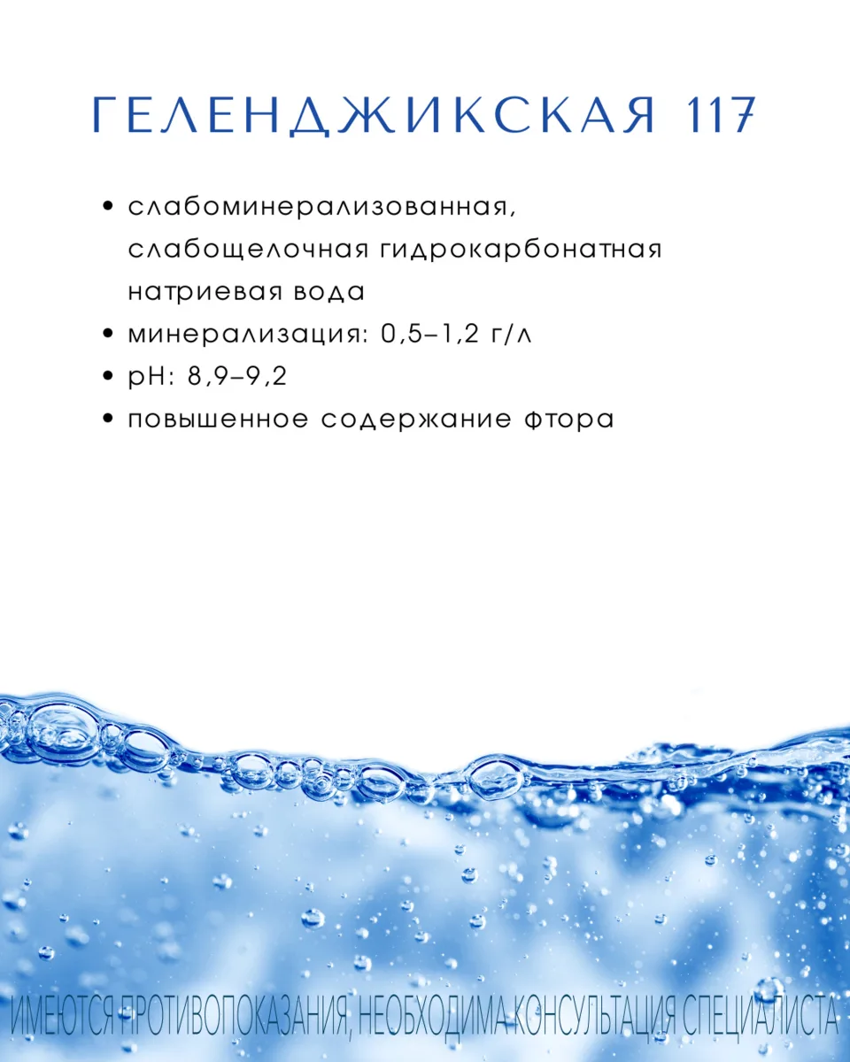 «Геленджикская 117» — это слабоминерализованная вода (минерализация от 0,5 до 1,2 г/л),