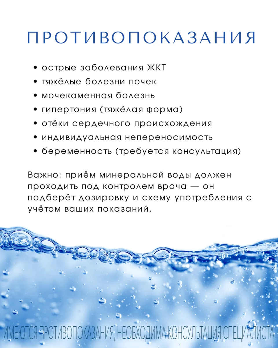 Важно: приём минеральной воды должен проходить под контролем врача — он подберёт дозировку и схему употребления с учётом ваших показаний.