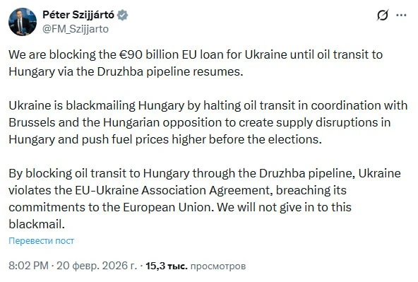 «Мы блокируем кредит ЕС в размере 90 миллиардов евро для Украины до тех пор, пока не возобновится транзит нефти в Венгрию по трубопроводу «Дружба». Украина шантажирует Венгрию, препятствуя транзиту нефти в координации с Брюсселем и венгерской оппозицией, чтобы вызвать перебои в поставках в Венгрию и поднять цены на топливо перед выборами. Блокируя транзит нефти в Венгрию по нефтепроводу «Дружба», Украина нарушает Соглашение об ассоциации между ЕС и Украиной, пренебрегая своими обязательствами перед Европейским союзом. Мы не поддадимся этому шантажу», – заявил Сийярто.