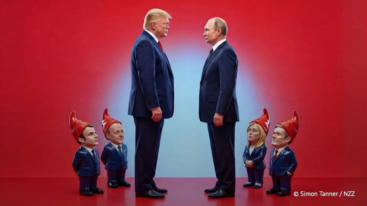 Швейцарская газета NZZ опубликовала изображение с Путиным и Трампом в окружении карликовых европейских лидеров. Иллюстрация сопровождает статью под названием "Трамп, Путин и множество карликов: почему Европа не взрослеет