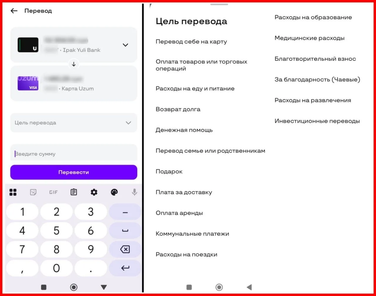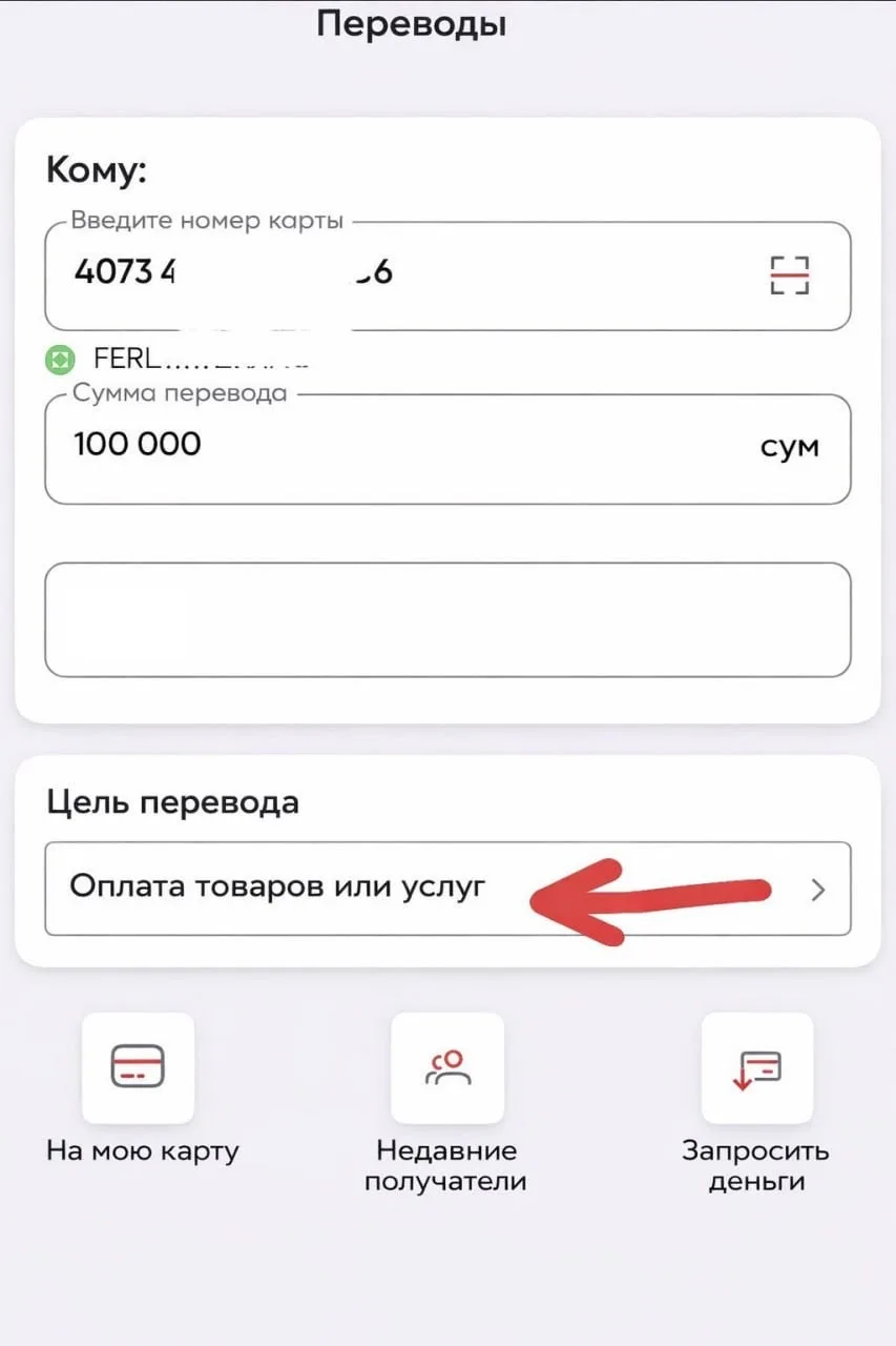 По данным Spot, ряд финтех-сервисов уже ввёл обязательный выбор цели P2P-перевода. В частности, такую функцию обнаружили в Uzum Bank — для завершения операции необходимо выбрать один из 16 вариантов назначения платежа.