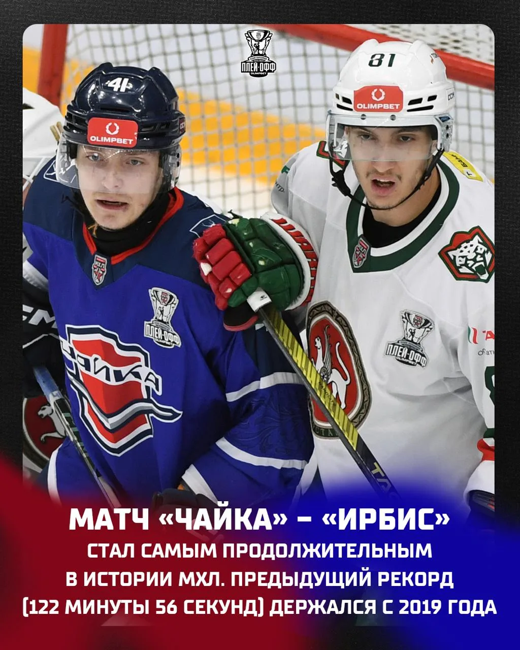 🏆 Матч первого раунда плей-офф МХЛ между "Чайкой" и "Ирбисом" стал самым продолжительным в истории турнира.