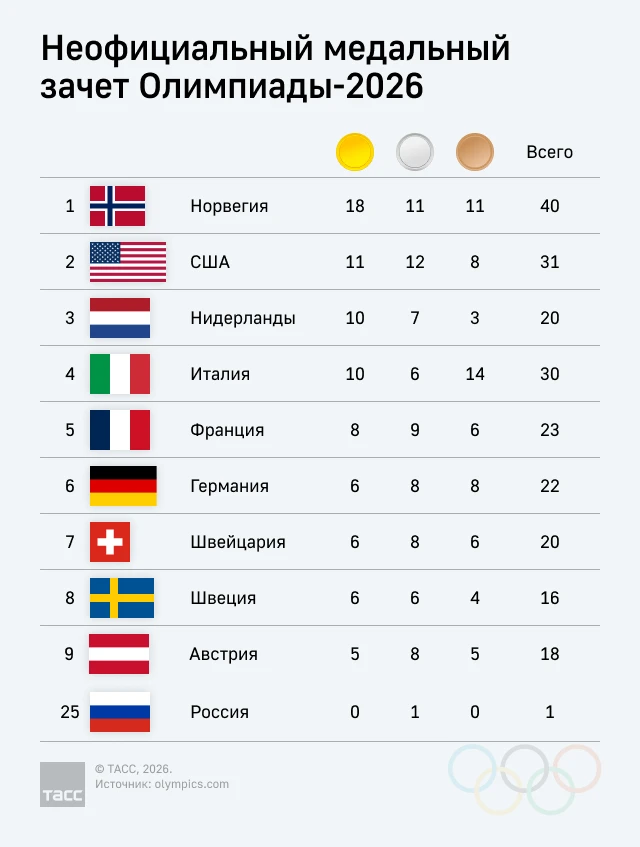 🏅 Сборная Норвегии досрочно выиграла медальный зачет Олимпиады-2026.