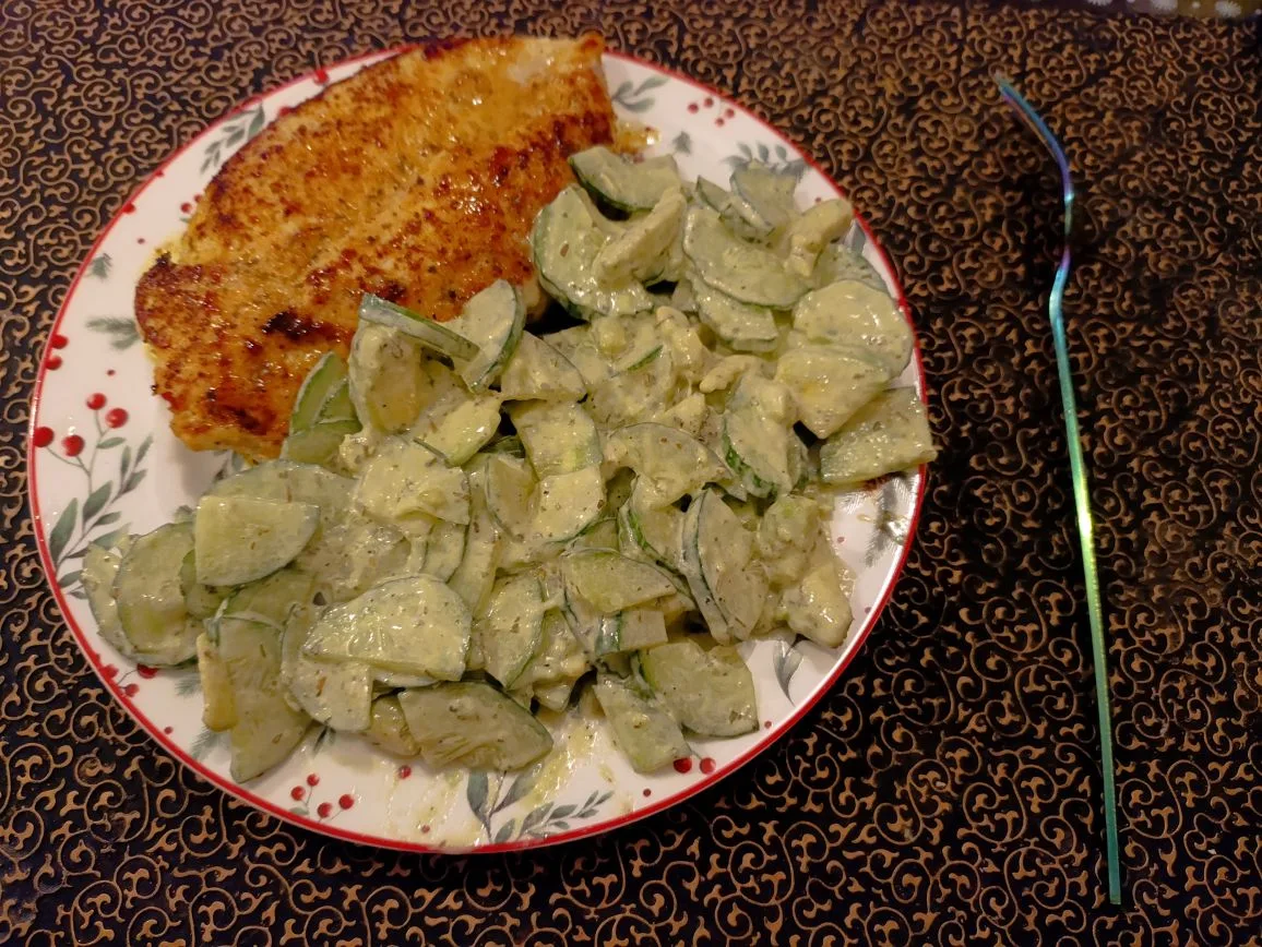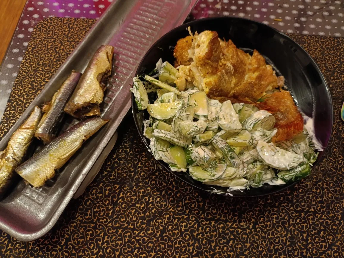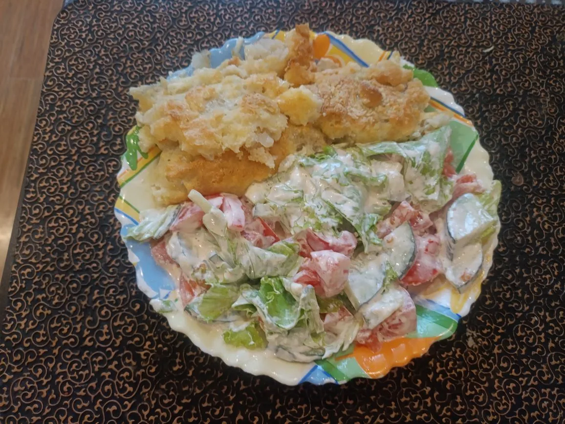 Морской окунь + огурцы с салатом и майонезом.