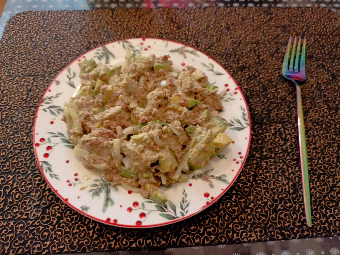 ✅ 200 гр куриной грудки, пожаренной без масла в пергаменте с приправами+ салат из 150 гр огурца и 1/2 авокадо, заправленный 15 гр майонеза без сахара. Соль, перец.