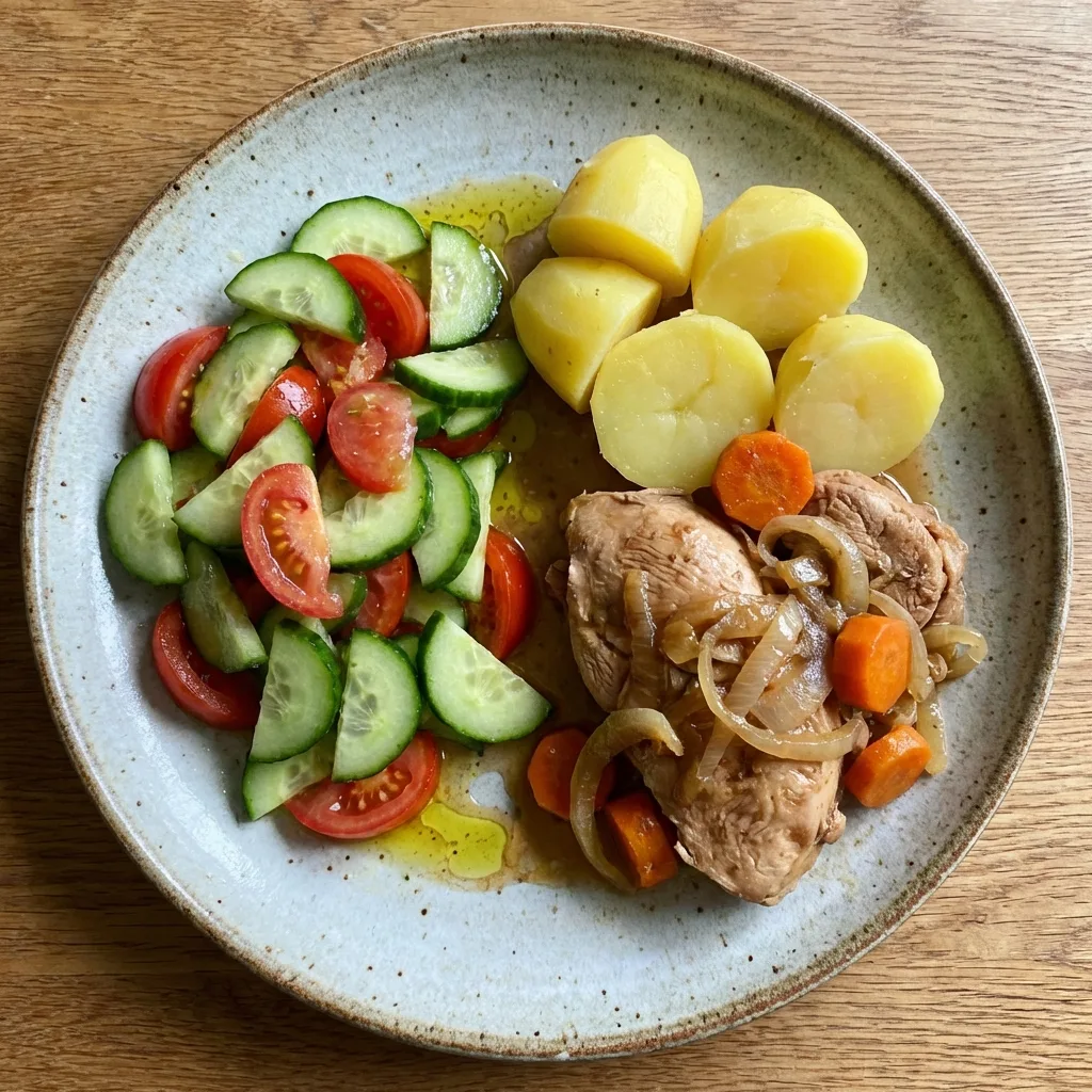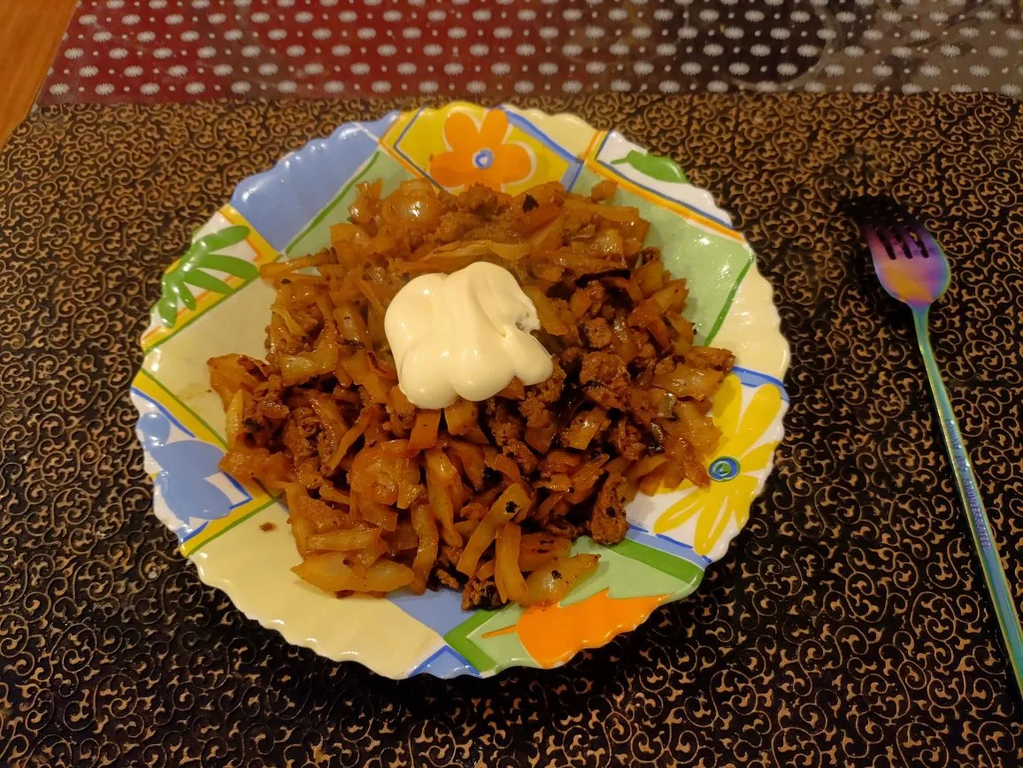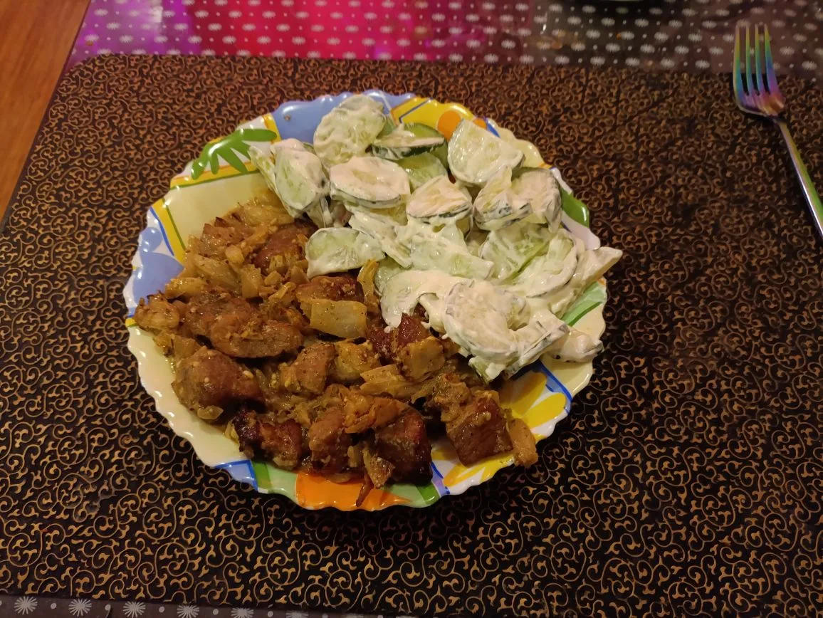 Ужин: шея свиная с капустой тушёные и салат из огурца с майонезом.
