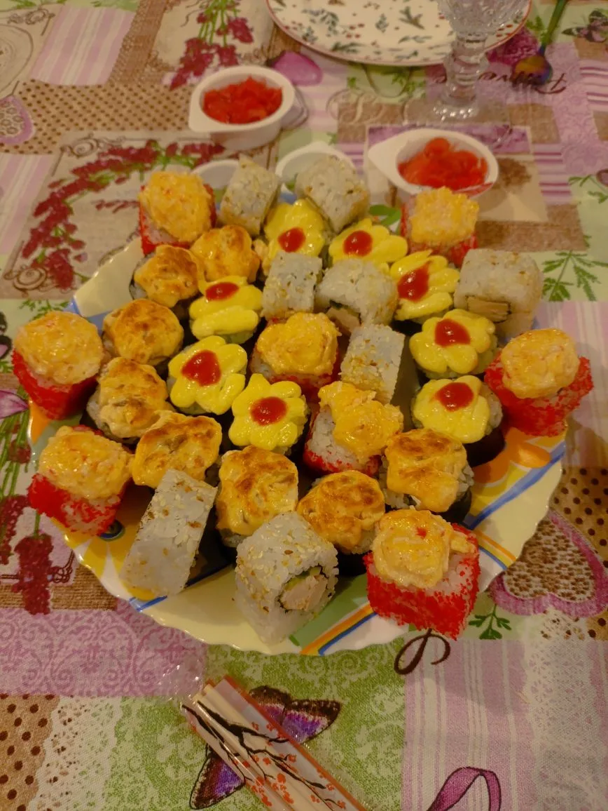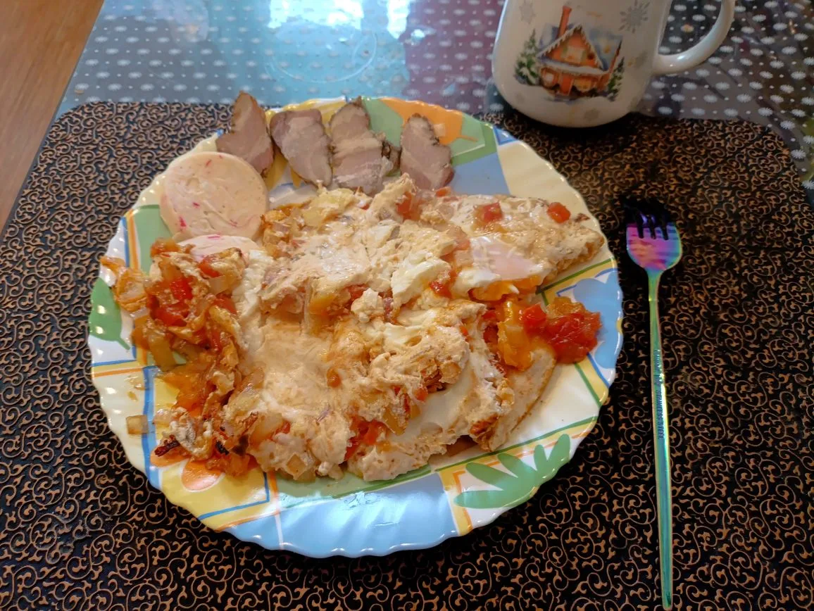 Завтрак: шакшука+сало+рулет крабовый