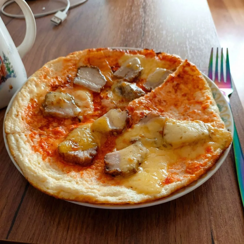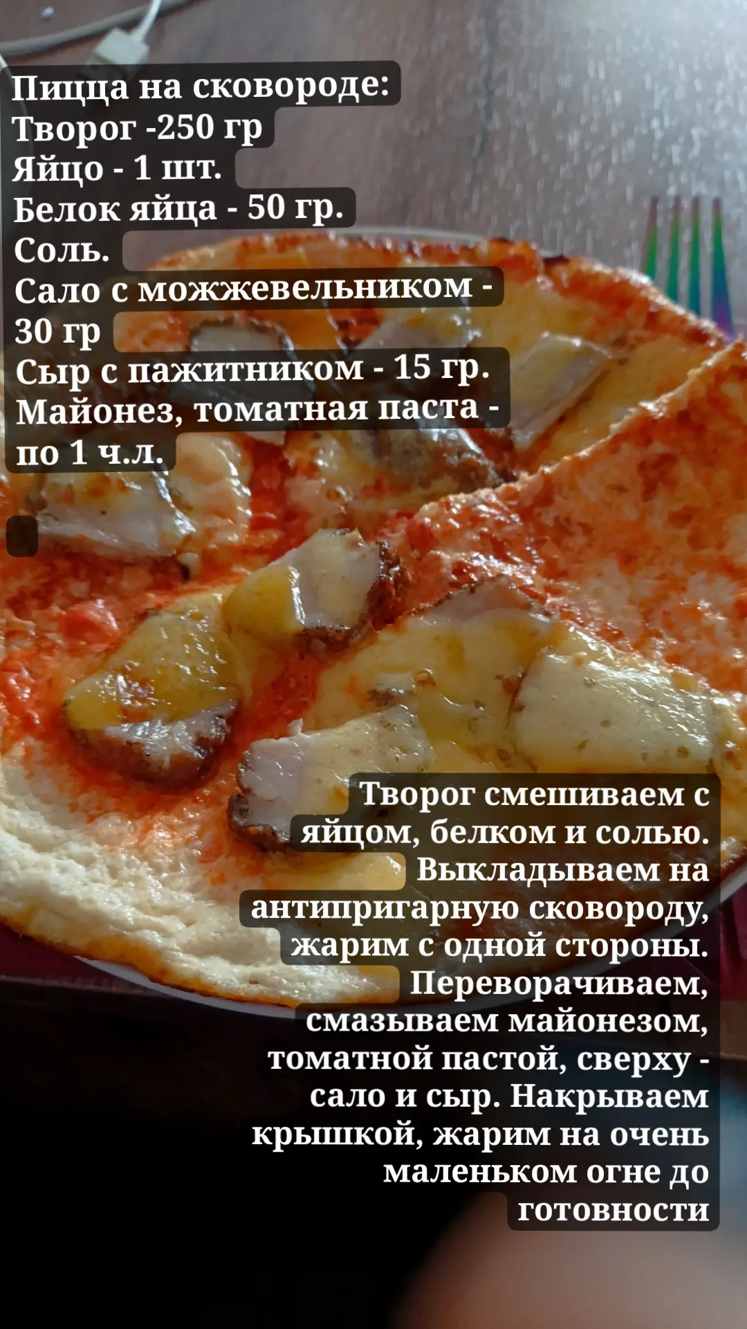 Завтрак: пицца на творожной основе с салом и сыром. Рецепт выше уже выложила.