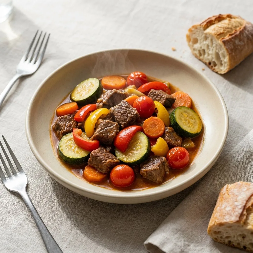 Овощи для тушения нарезать, сложить в сотейник, добавить томат и 10 г масла, тушить 15–20 минут до мягкости, посолить.