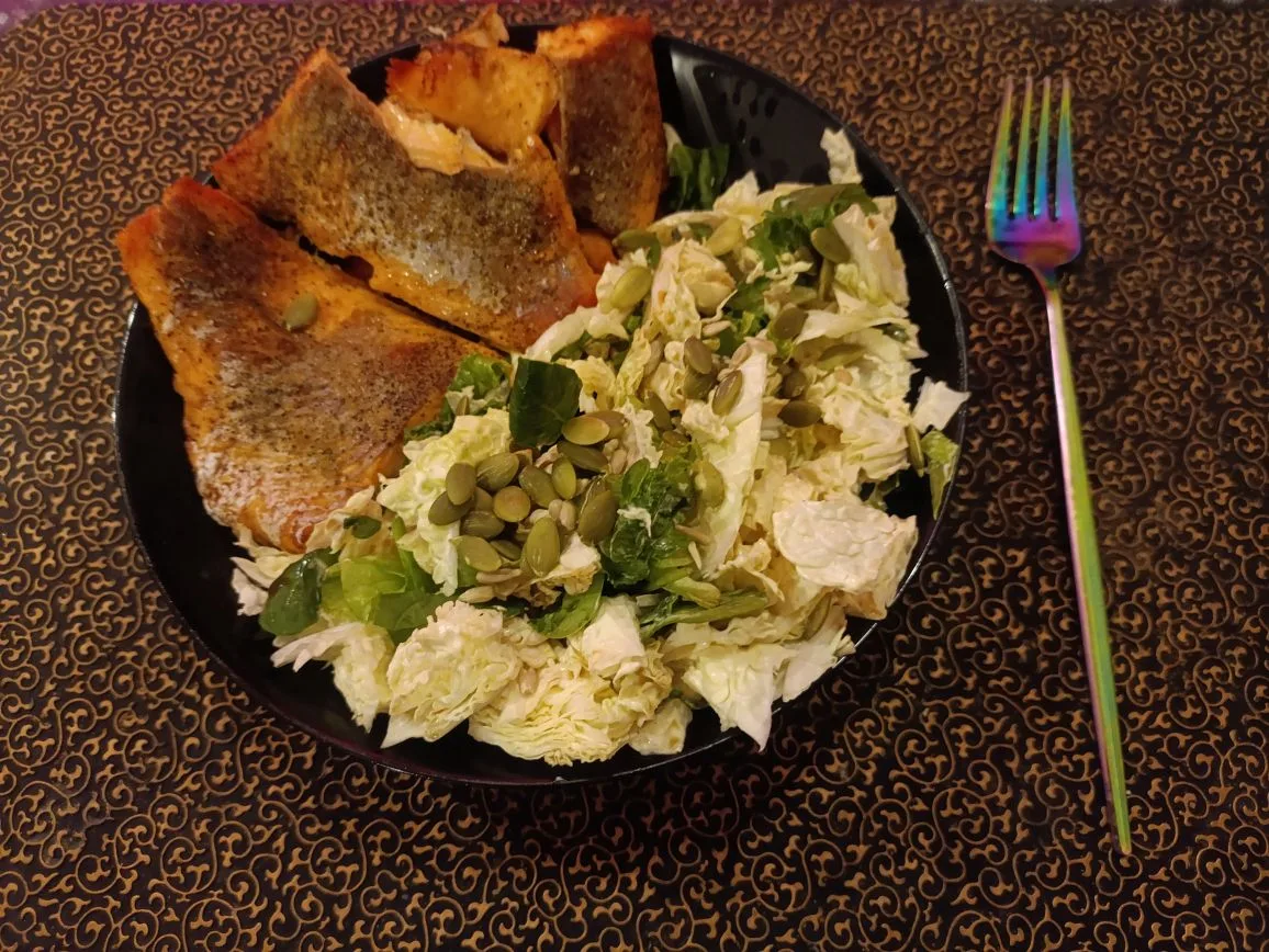 ✅ форель 250 гр на решетке в аэрогриле + салат из зелени с семечками (1 ст ложка на все семечки)+ 1 ст ложка майонеза без сахара.