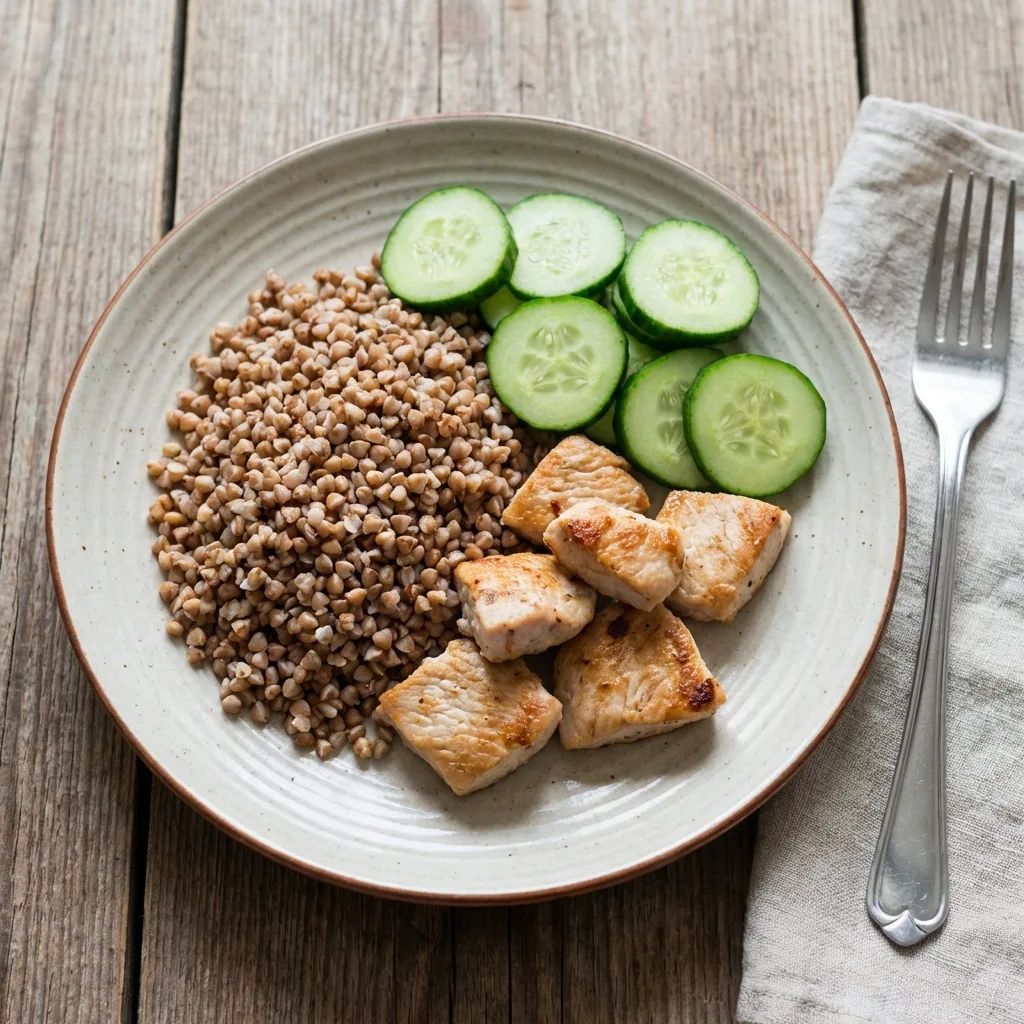 1) Гречка: промыть, залить водой 1:2, довести до кипения, варить под крышкой 12–15 минут, дать настояться.