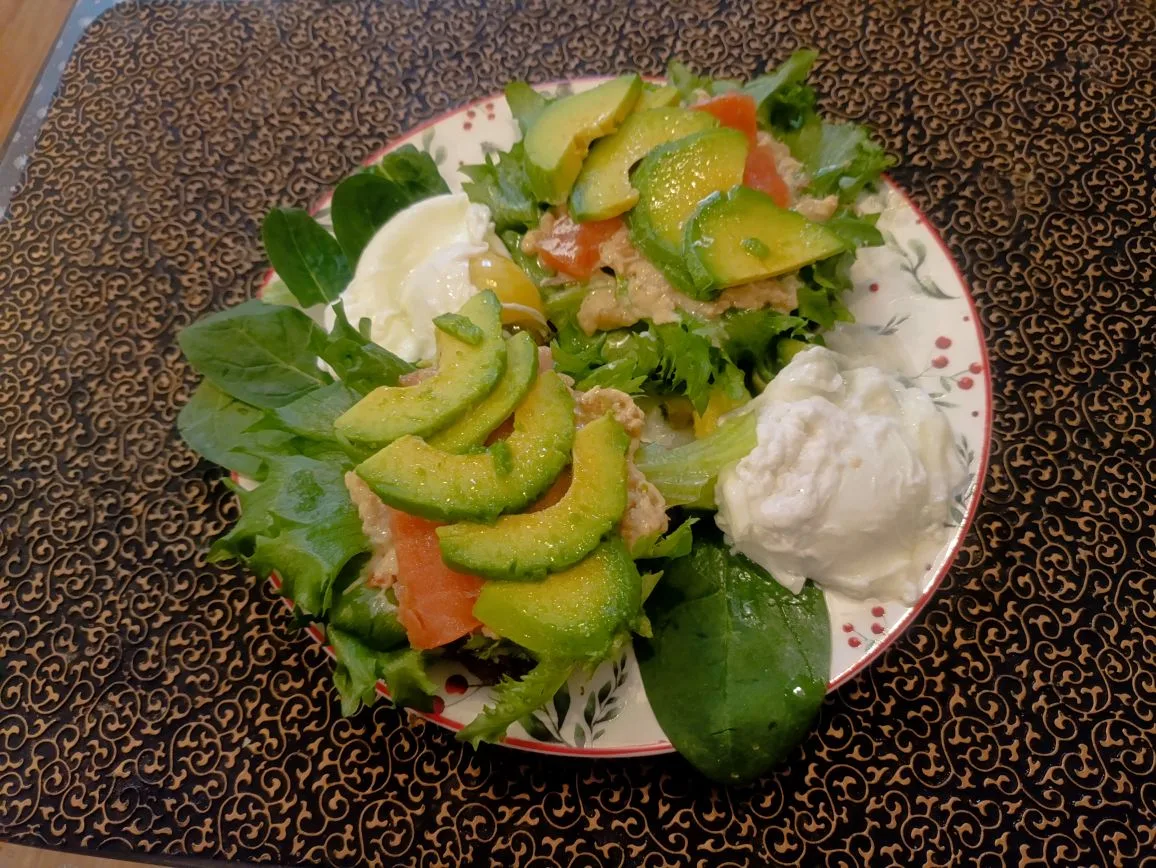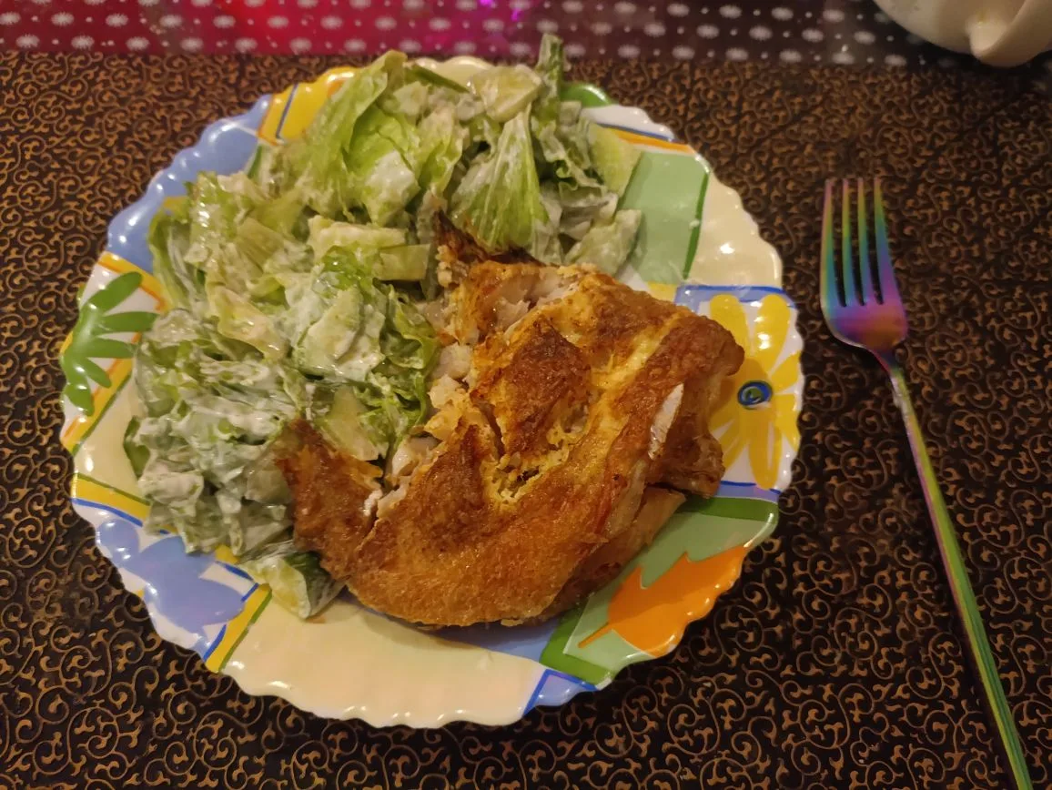 Остатки салата + жареная форель.