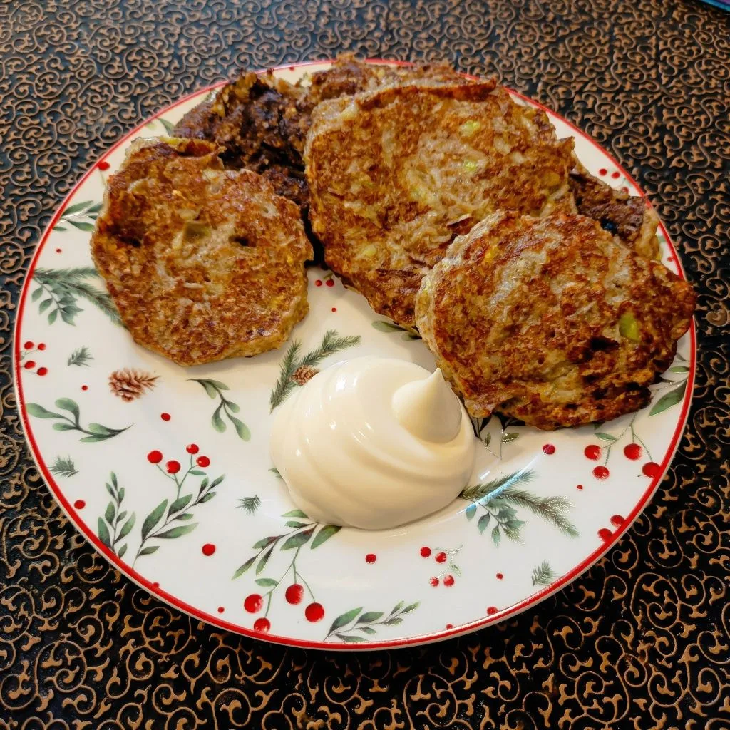 Обед: кабачковые оладьи с клетчаткой (вместо муки) и сметаной.
