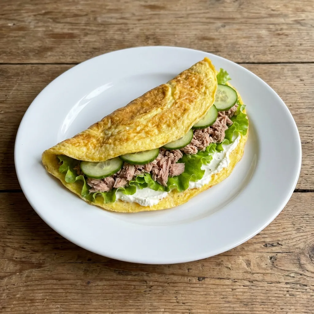 Выложить творожный сыр, тунца, салат и огурец, сложить омлет пополам.