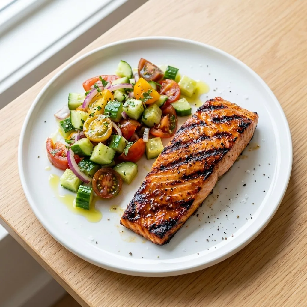 ✅ 18:00 Лосось на гриле с салатом из огурцов, помидоров и оливкового масла