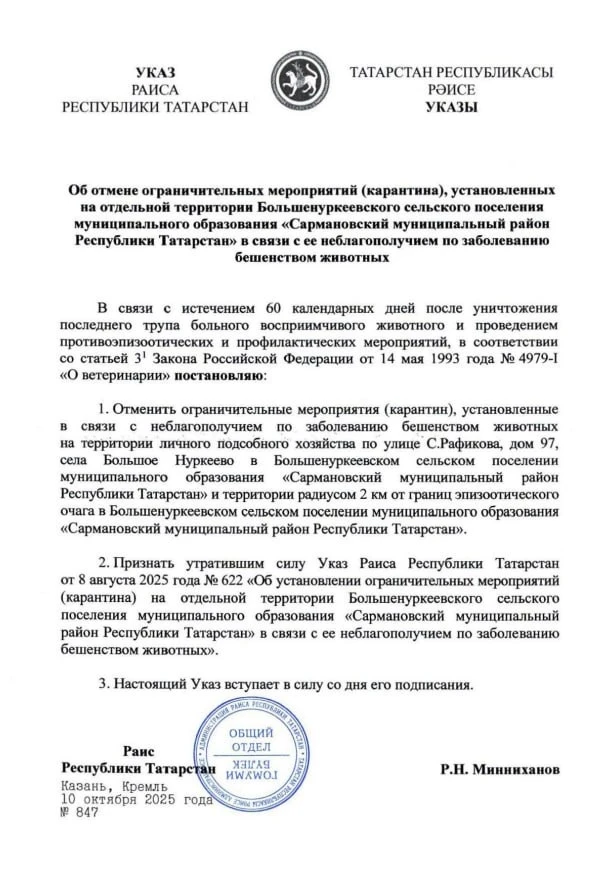 📄👌В Татарстане отменили карантин, действовавший на территории одного хозяйства в Большенуркеевском селе Сармановского района