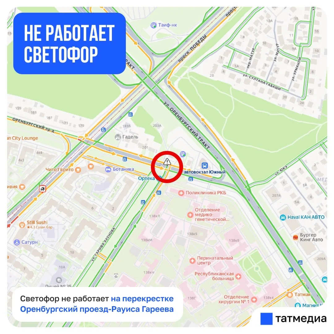 🚦🚗 В Казани на перекрестке Оренбургского проезда и улицы Рауиса Гареева не работает светофор