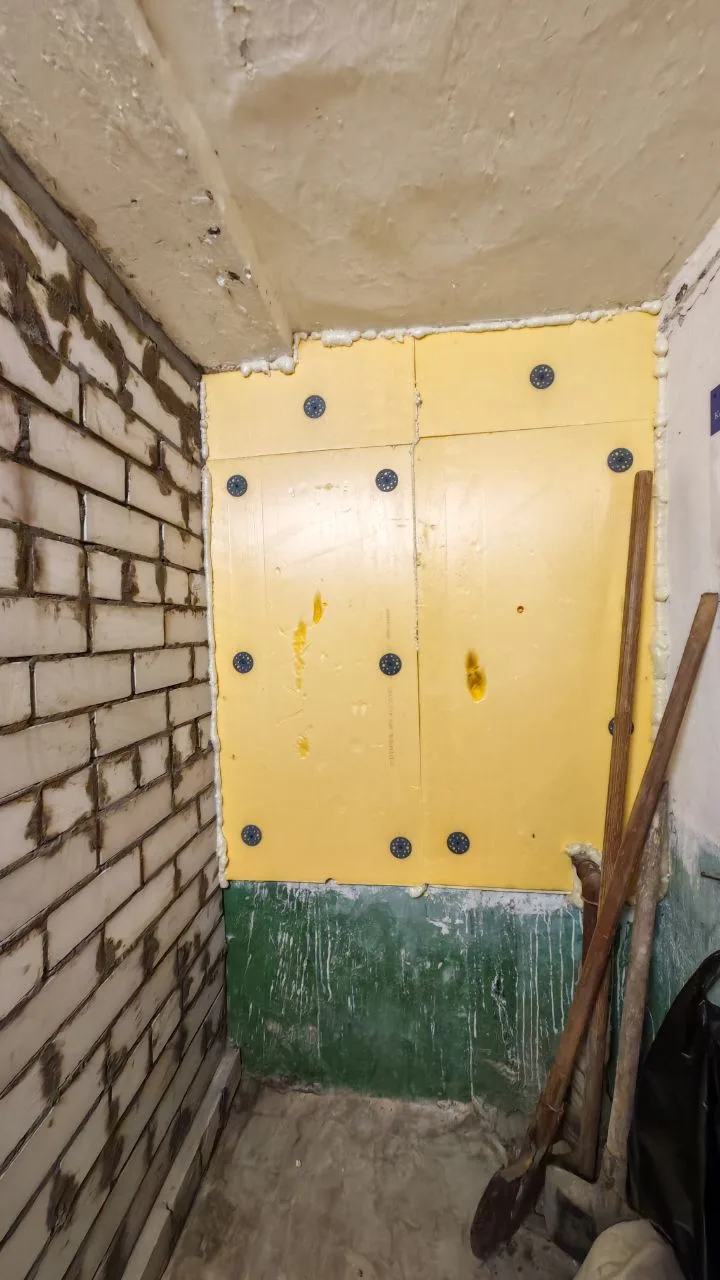 Почему не всю стену до пола, спросите вы? Потому что там идёт утолщение стены на ширину пенополистирола и в подъезд мы входим, спускаясь вниз. То бишь, уровень пола в квартире значительно ниже, чем в этой части подъезда.