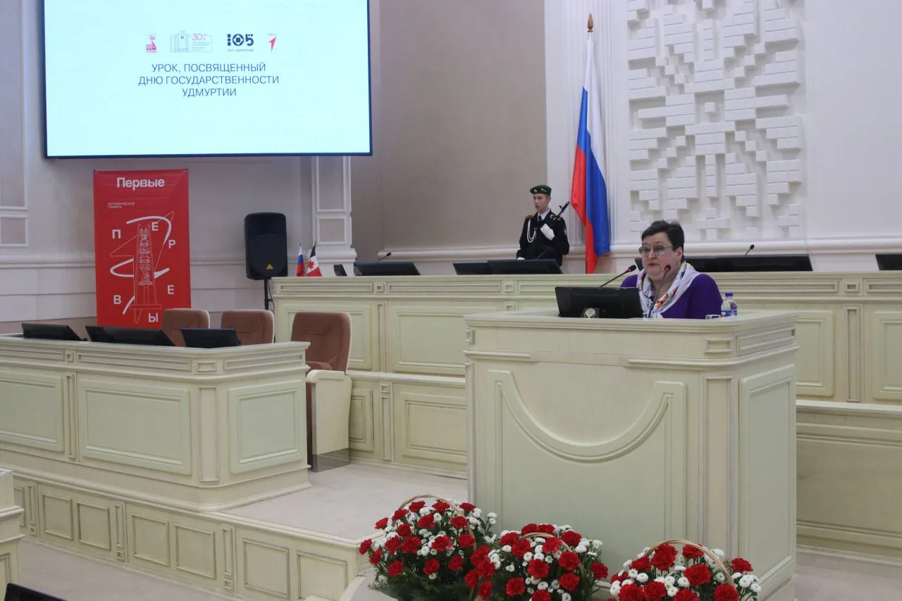 Также в ходе Урока ребята погрузились в историю становления государственности Удмуртии. Кандидат исторических наук Наталья Бармина рассказала о формировании территории Удмуртии, изменениях в административном устройстве, о событиях и решениях, которые позволили Удмуртии 105 лет назад обрести свою государственность. Особое внимание было уделено вкладу выдающихся общественных и государственных деятелей, стоявшим у истоков создания автономии, - Максиму Прокопьеву, Трокаю Борисову и Иосифу Наговицыну.