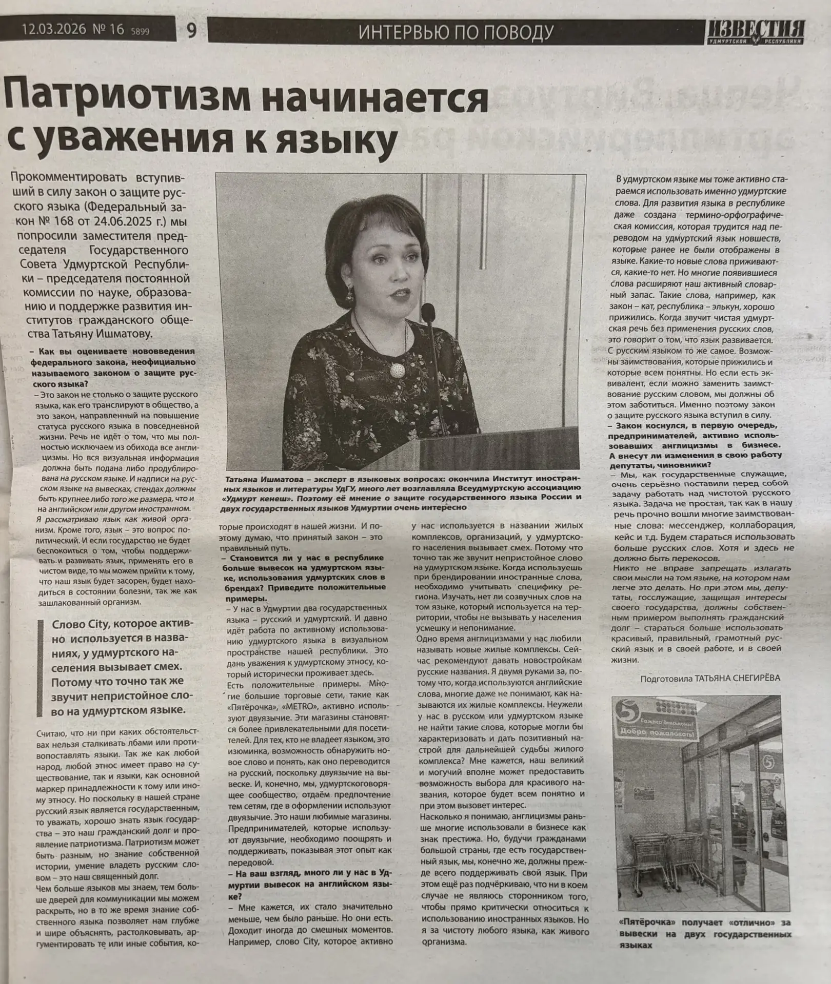 - У нас в Удмуртии два государственных языка - русский и удмуртский. И давно идёт работа по активному использованию удмуртского языка в визуальном пространстве нашей республики. Это дань уважения к удмуртскому этносу, который исторически проживает здесь. Есть положительные примеры. Многие большие торговые сети, такие как «Пятёрочка», «METRO», активно используют двуязычие. Эти магазины становятся более привлекательными для посетителей. Для тех, кто не владеет языком, это изюминка, возможность обнаружить новое слово и понять, как оно переводится на русский, поскольку двуязычие на вывеске. И, конечно, мы, удмуртскоговорящее сообщество, отдаём предпочтение тем сетям, где в оформлении используют двуязычие. Это наши любимые магазины. Предпринимателей, которые используют двуязычие, необходимо поощрять и поддерживать, показывая этот опыт как передовой.