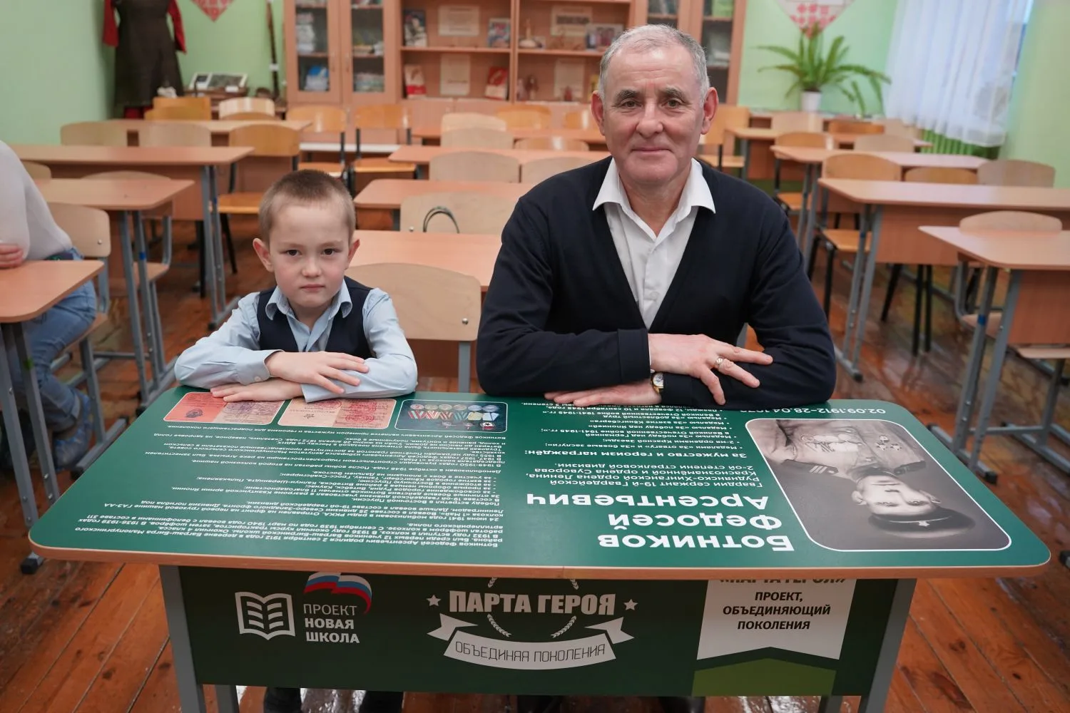 Право первыми сесть за Парту Героя предоставлено младшему сыну Федосея Ботникова - Владимиру Федосеевичу и правнуку Героя - первокласснику Дмитрию.