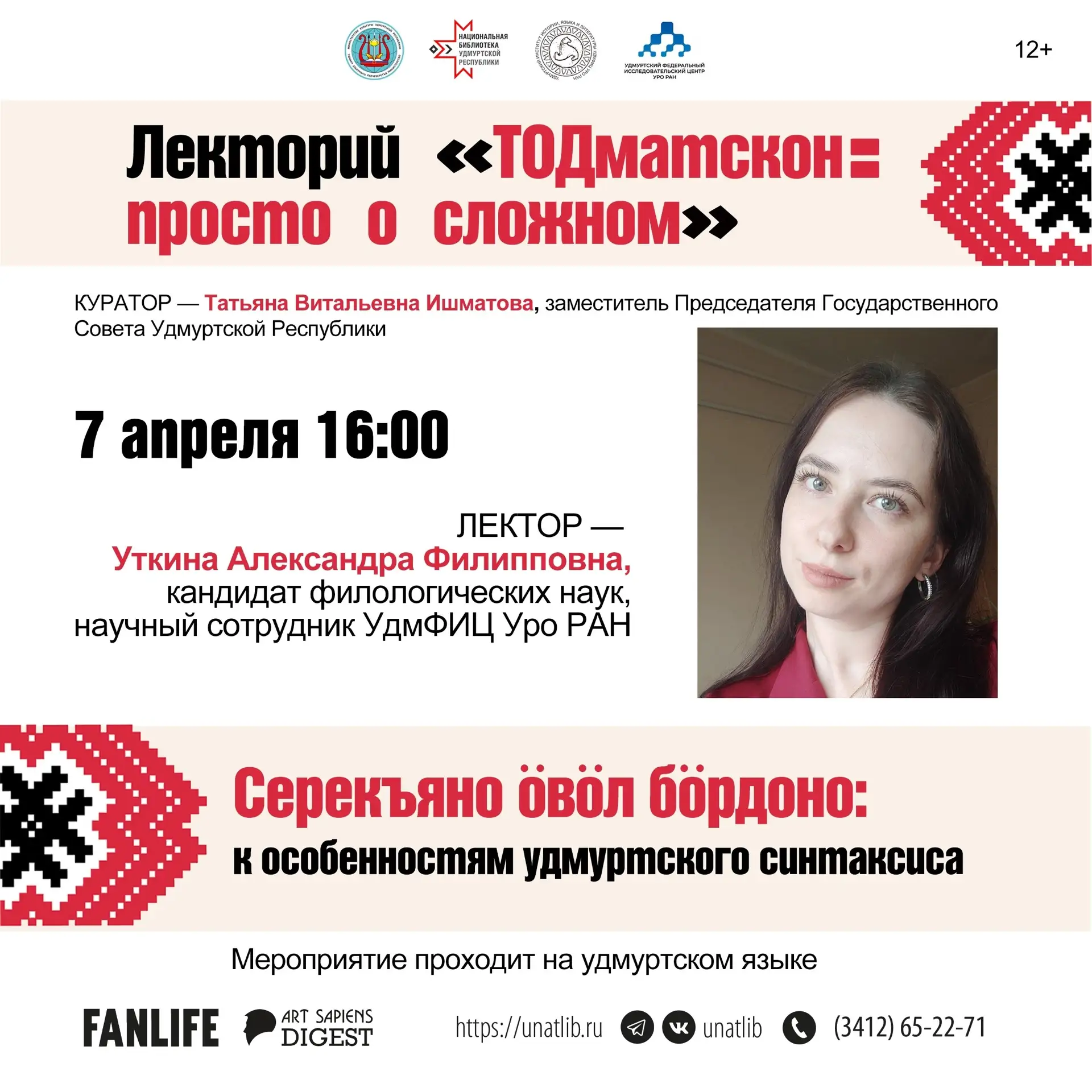 Кандидат филологических наук, научный сотрудник УдмФИЦ УрО РАН Александра Филипповна Уткина доступным языком разъяснила, как устроены предложения в удмуртском языке и как менялся синтаксис со временем. Обсудили, когда появилась удмуртская письменность, как выглядели предложения в ранних письменных памятниках и какое влияние на современный удмуртский язык оказал русский язык.