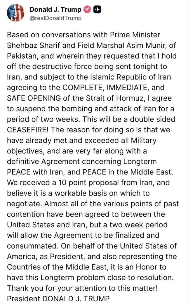 Исходя из переговоров с премьер-министром Пакистана Шехбазом Шарифом и фельдмаршалом Асымом Муниром, а также с учётом их просьбы воздержаться сегодня ночью от применения силы против Ирана, я соглашаюсь приостановить бомбардировки и атаки по Ирану на срок двух недель — при условии, что Исламская Республика Иран согласится на полное, немедленное и безопасное открытие Ормузского пролива. Это будет взаимное прекращение огня.