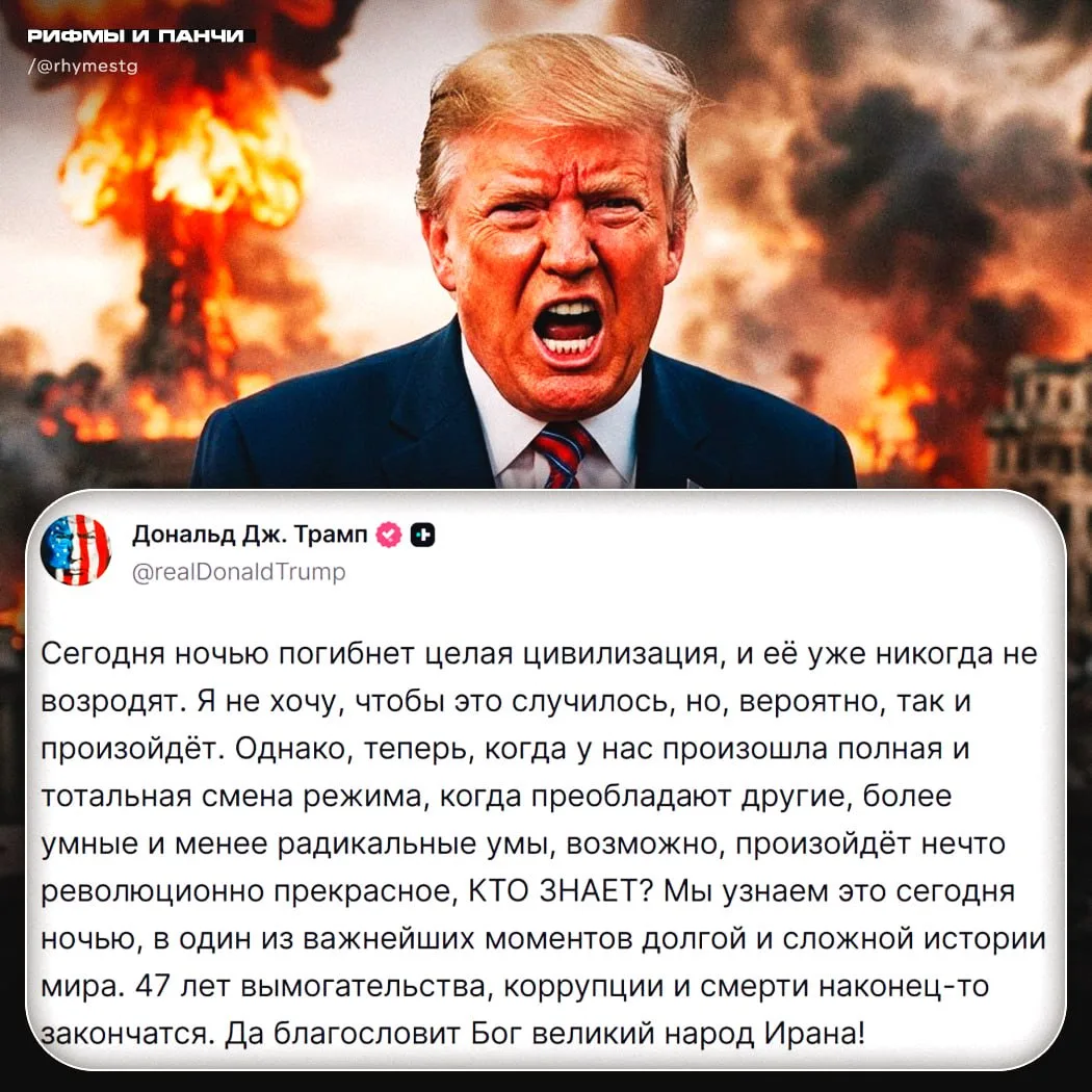 Поводом стали жёсткие заявления Трампа о том, что «ночью может исчезнуть целая цивилизация». Дедлайн Трампа по уничтожению Ирана истекает ночью в 3:00 по МСК: