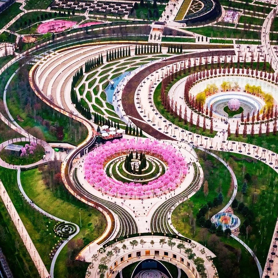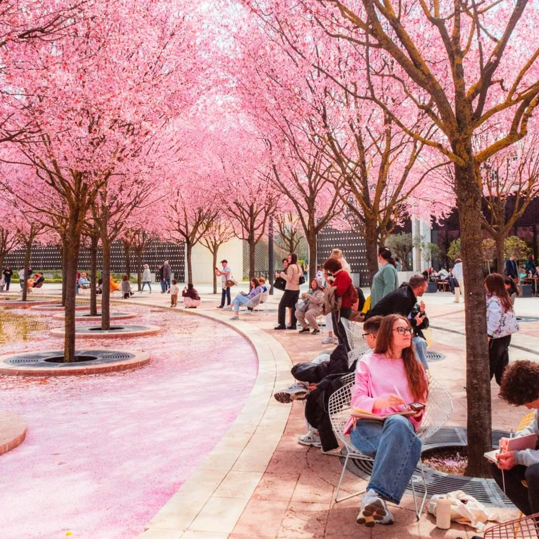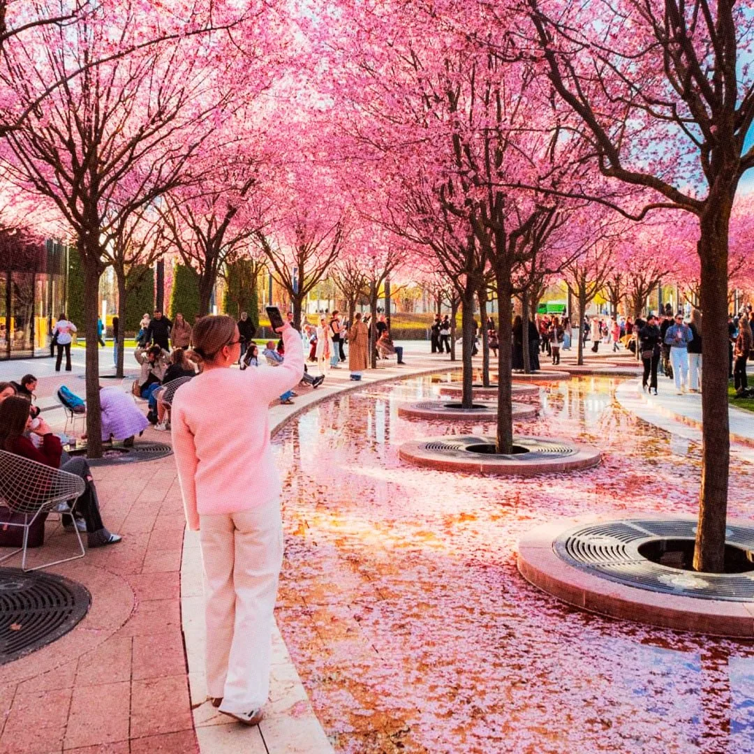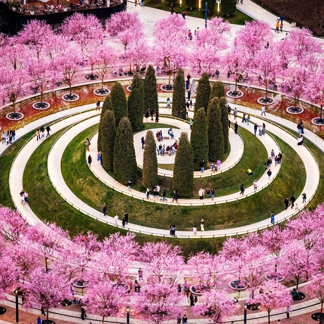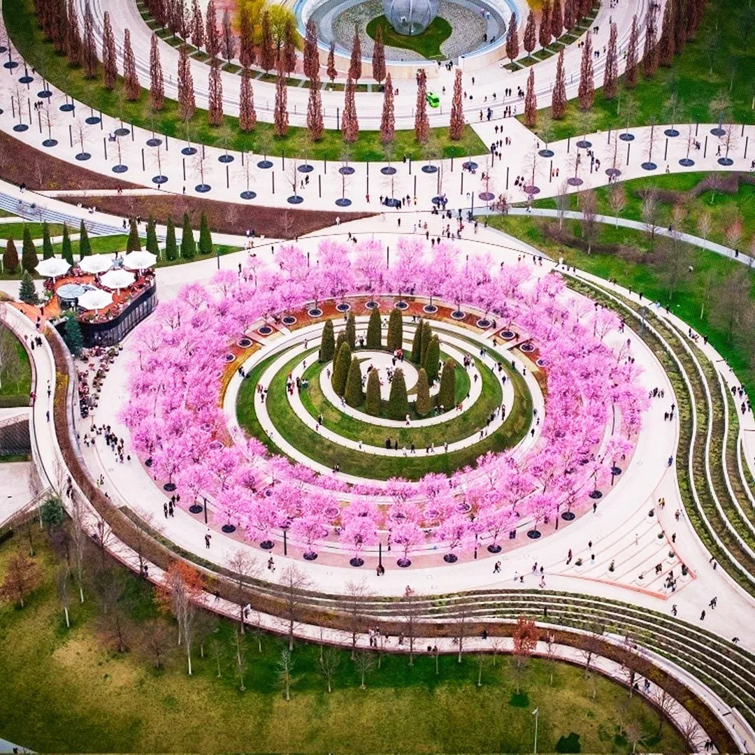 Деревья с ярко-розовыми листьями визуально напоминают сакуру, из-за чего парк сейчас выглядит как кадр из японского аниме