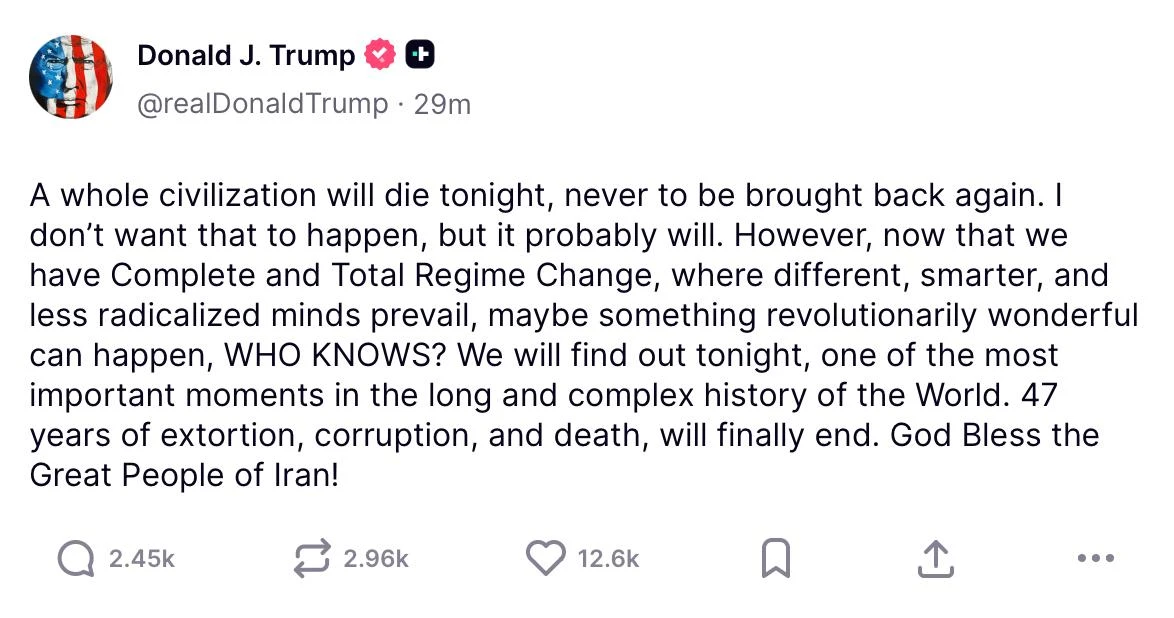 Трамп заявил, что сегодня может погибнуть «целая цивилизация» - этот психопат реально готовит что-то страшное? Применение ядерного оружия? Тотальное уничтожение иранской энергетики?