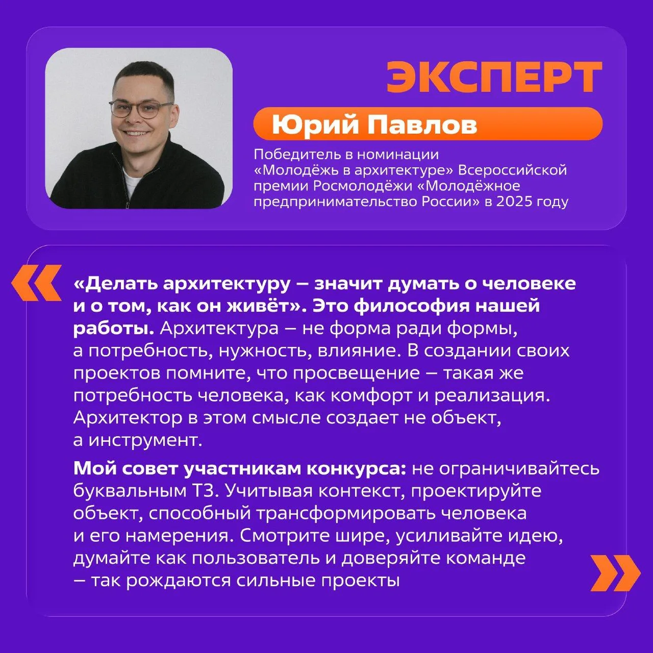 ❇️ Юрия Павлова, победителя Всероссийской премии Росмолодёжи «Молодёжное предпринимательство» в номинации «Молодёжь в архитектуре»