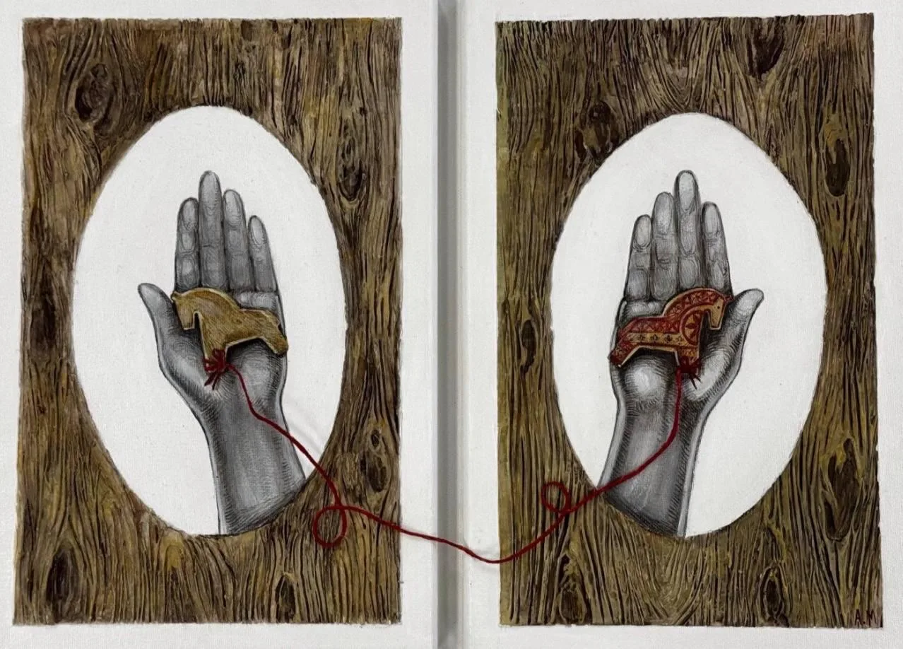 Через деревянные ставни, будто через время, мы видим ладони. В них две мезенские игрушки и нить, соединяющая их, — символ непрерывности.