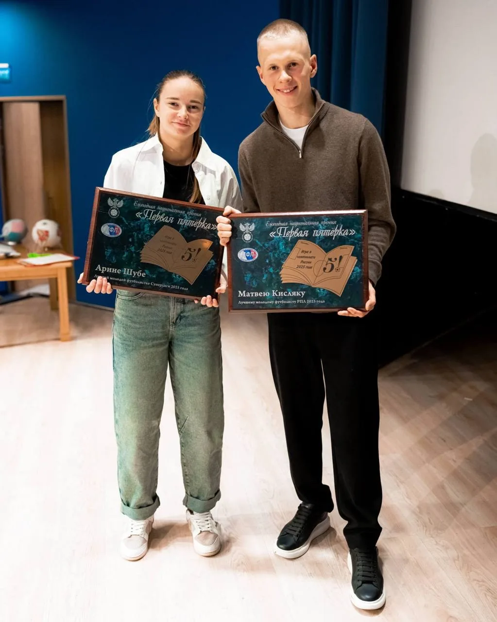 Торжественное награждение лауреатов премии ДФЛ прошло 10 января в Москве. Матвей стал лучшим молодым футболистом РПЛ в 2025 году, Арина Шуба — в Суперлиге.