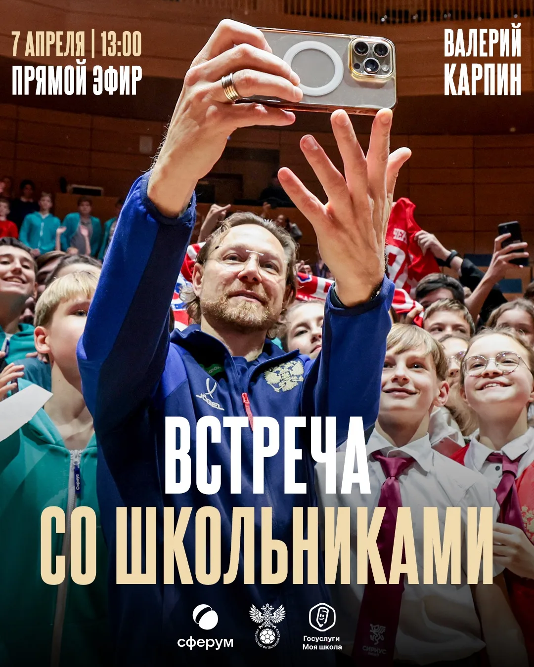 РФС и Сферум 7 апреля в 13:00 проведут онлайн-конференцию для юных болельщиков и участников проекта «Футбол в школе» и пользователей сервиса «Госуслуги. Моя школа», которые смогут задать свой вопрос главному тренеру сборной России.