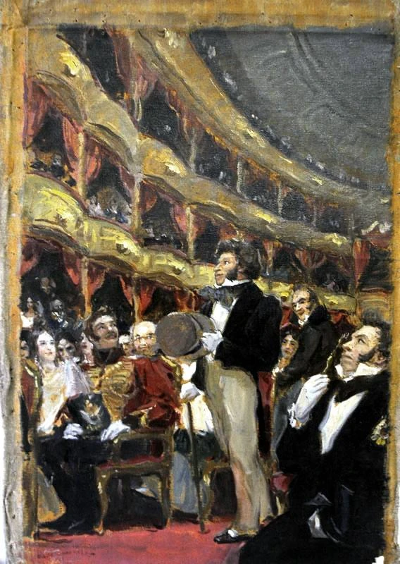 В 1818 году, после тяжелой болезни, ему сбрили волосы, и он стал носить парик. Это придавало его привычному облику некую эксцентричность, хотя выглядело это не слишком удачно. Однажды, в Большом театре, он заглянул в нашу ложу. Мы решили, что наш озорник будет вести себя тихо, но ошиблись. В самый разгар трогательной сцены Пушкин, жалуясь на жару, снял свой парик и начал обмахиваться им, словно веером. Это вызвало смех у зрителей в соседних ложах и привлекло внимание всех, кто сидел в креслах. Мы пытались его успокоить, но он соскользнул со стула на пол и устроился у нас под ногами, прячась за барьером. В конце концов, он натянул парик на голову, как шапку, и выглядел при этом настолько комично, что невозможно было сдержать смех! Так он и просидел на полу до конца спектакля, отпуская шутки о пьесе и игре актеров.