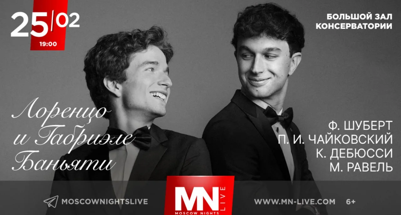 25 февраля в Большом зале Московской консерватории выступит итальянский фортепианный дуэт Лоренцо и Габриэле Баньяти. Два выдающихся молодых итальянских пианиста — братья Лоренцо (1998) и Габриэле (2002) Баньяти — представят московской публике яркую программу шедевров музыки для фортепиано в четыре руки. Зрители смогут услышать полные лиризмапроизведения Мориса Равеля, Франца Шуберта, Клода Дебюсси и Петра Ильича Чайковского. Братья Баньяти — безусловные звёзды молодого поколения европейских пианистов. Оба родились в Милане в музыкальной семье, начали заниматься фортепиано в четыре года и уже в детском возрасте выступали с оркестрами, завоевывая первые премии на престижных международных конкурсах.
