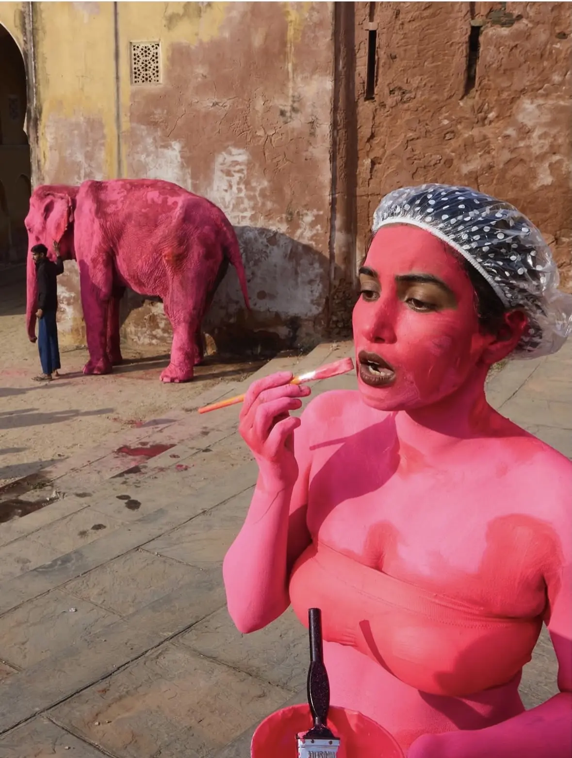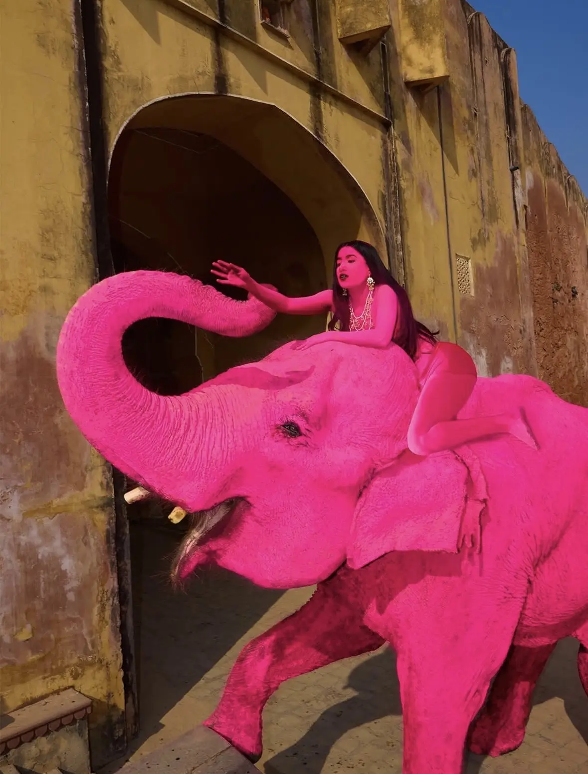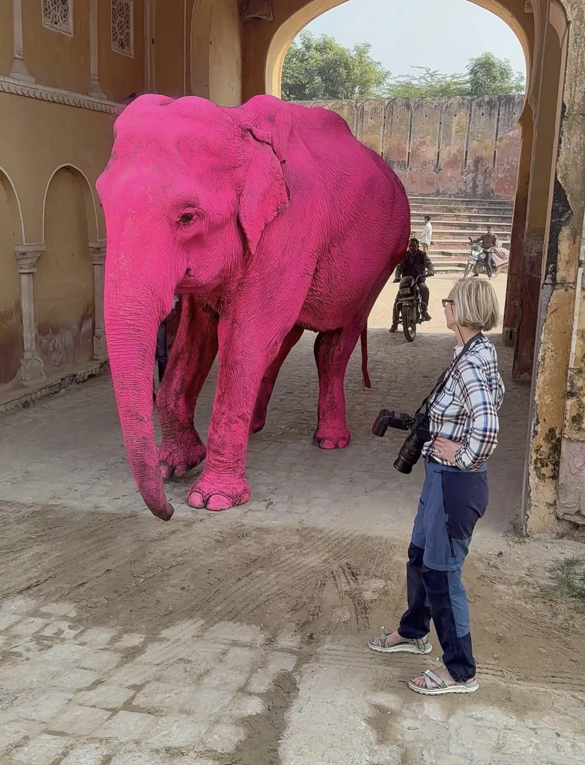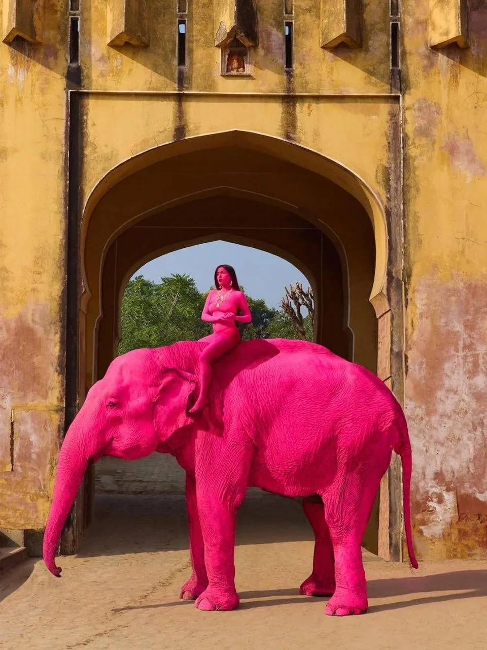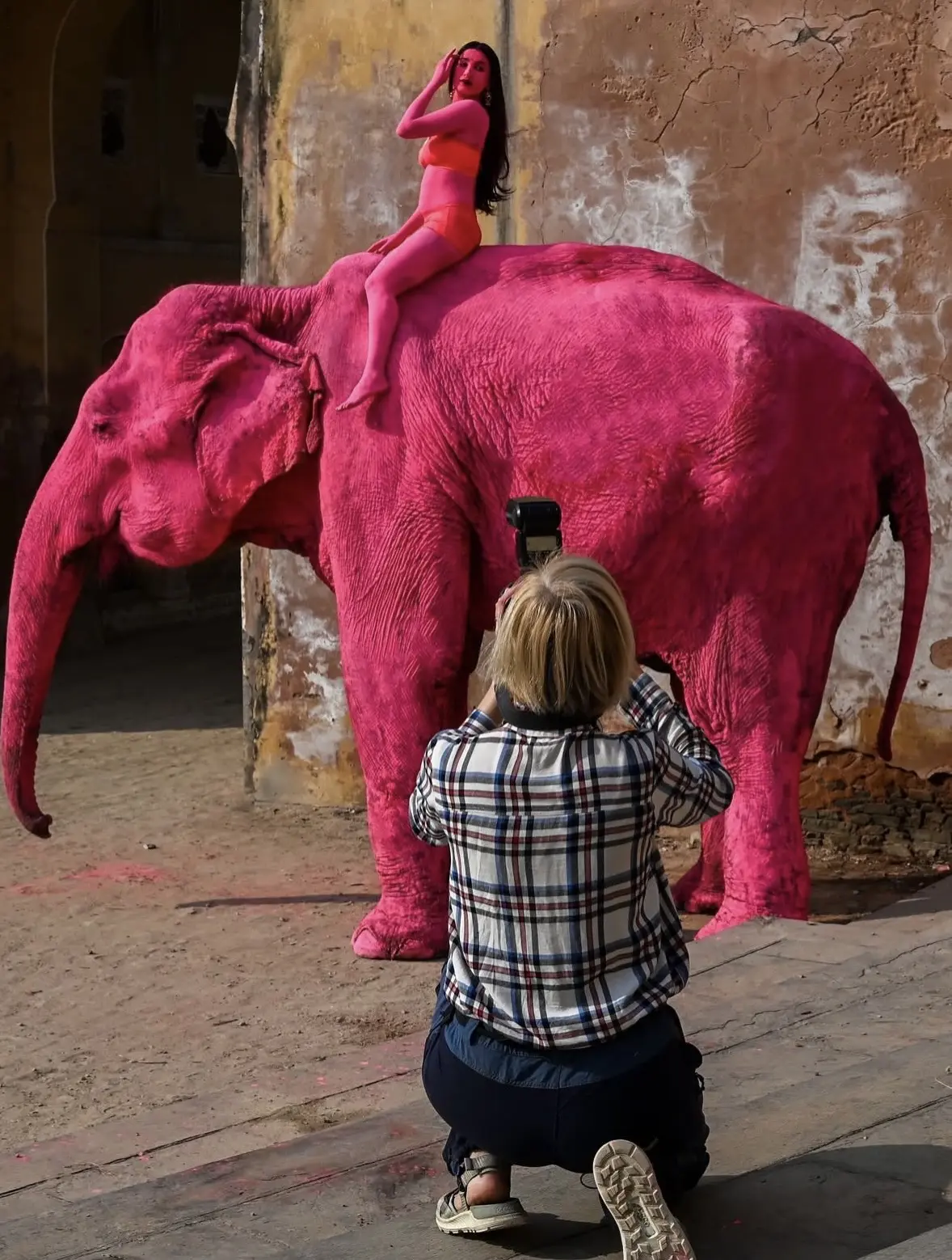 В декабре в Индии в Джайпуре фотограф Юлия Бурулева устроила съемки с 65-летней слонихой Чанчал, покрасив ее для красоты кадров и ради задумки в розовый цвет.