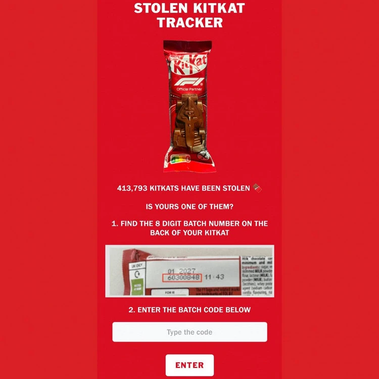 Теперь компания начала делать трекер для своих батончиков. Можно зайти на сайт, вбить код и посмотреть, была ли ваша шоколадка украдена.