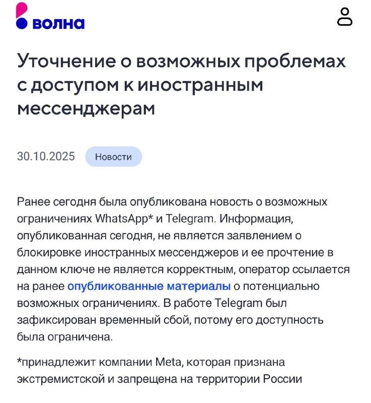 Местный оператор «Волна» подтвердил – Telegram и WhatsApp* теперь ограничены в Крыму по требованию РКН. Все операторы обязаны подчиниться.