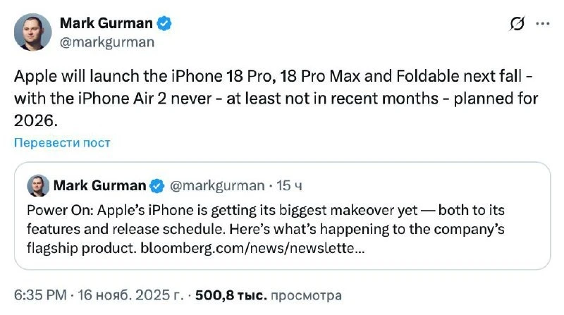 Apple планируют показать только три модели – Pro, Pro Max и новый складной iPhone. Бюджетные iPhone 18 и iPhone 18e выйдут через полгода вместе со вторым поколением iPhone Air.