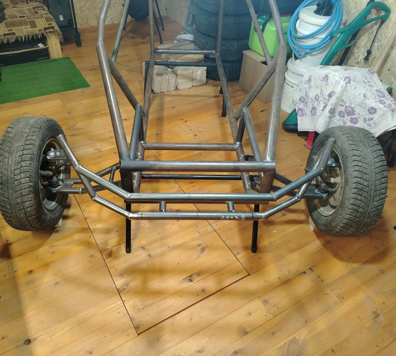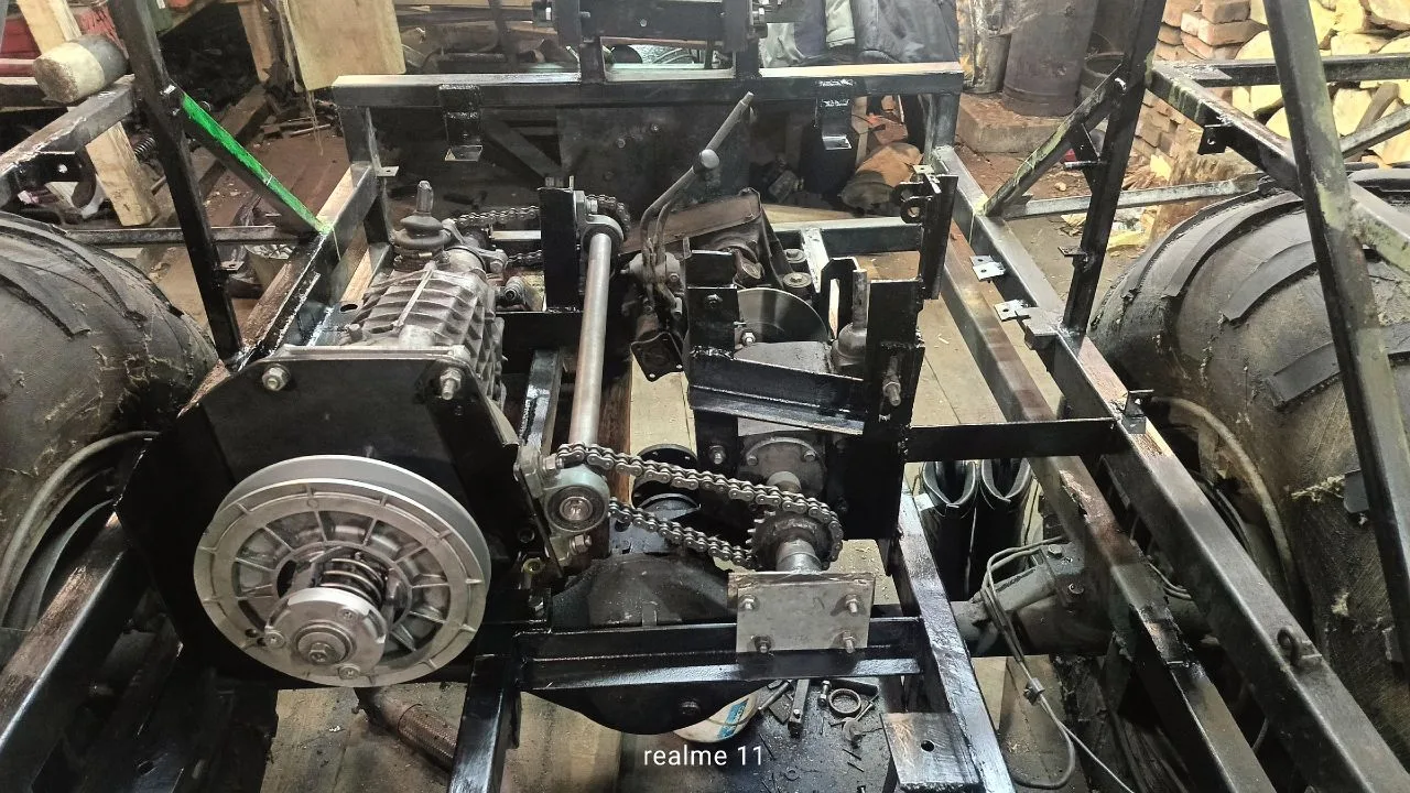 Собирал за 2 года, в этом году кун доделываю, мотор 20 лс, КПП ваз- 2110 через шкивы от мотора сцепление ВАЗ, раздатка нива, везде крестовины за место шрус, кроме на задний мост стоит 1шрус, мосты ВАЗ, резина на 14 Груберг, раздатка нива, стоит но 32 , дозотор, распределитель 3 секции.