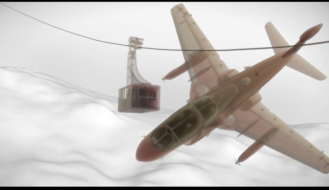 Самолет летел со скоростью 540 миль/час (870 км/ч) и на высоте от 260 до 330 футов (от 80 до 100 метров) в узкой долине между горами, когда внезапно пилоты увидели прямо перед собой странный трос. Они резко спикировали, но было уже поздно. Трос как бензопила прорезал правую консоль крыла примерно до середины. Сразу же отказала гидравлика и появилась утечка топлива. Пилоты начали набор высоты для более безопасного катапультирования. Чуть позже они поняли что управлять самолётом можно, хоть и с трудом. Поэтому они направились на базу, где вскоре благополучно приземлились. Ни один из членов экипажа на борту самолёта не пострадал.