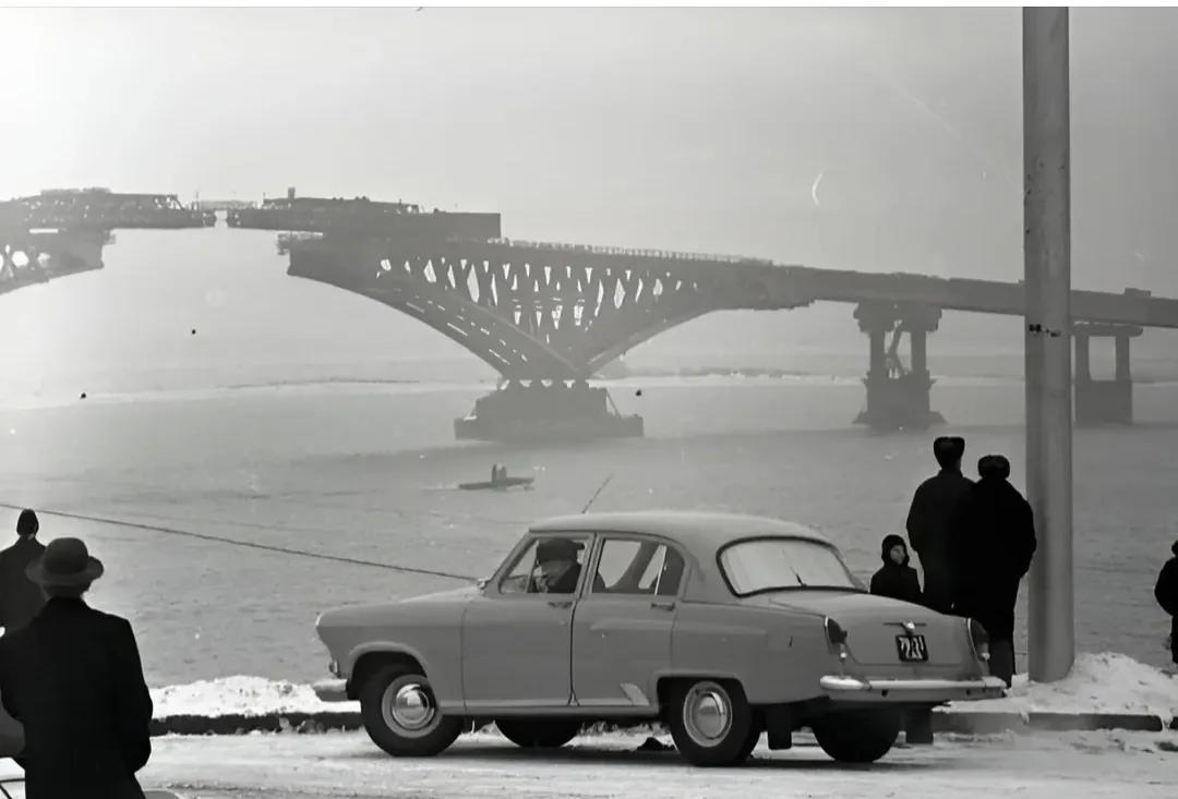 Наведение последнего пролета "Саратовского" моста над Волгой. Мост соединил два города: на правом берегу Волги - Саратов, на левом - Энгельс. Фото от 30 ноября 1964 года.