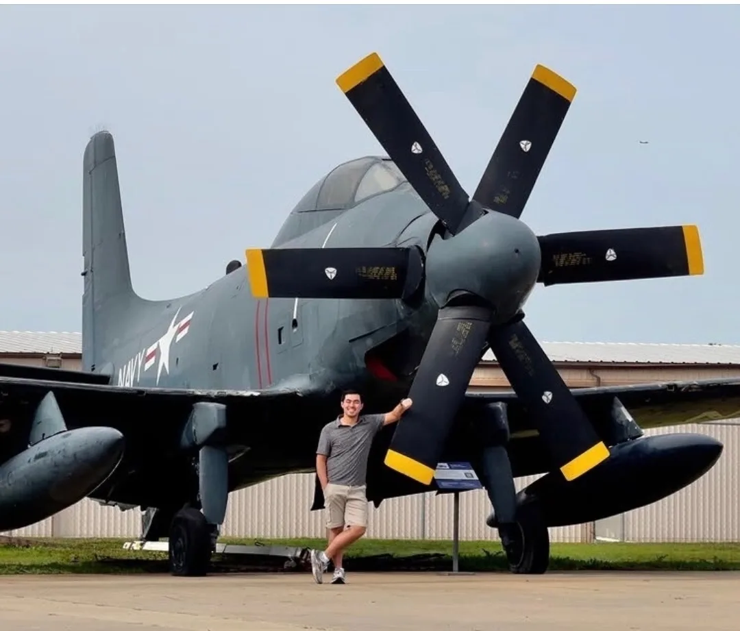 Молодой человек у несостоявшегося американского корабельного ударного самолёта A2D-1 в экспозиции Аэрокосмического музея Сан-Диего (Калифорния).
