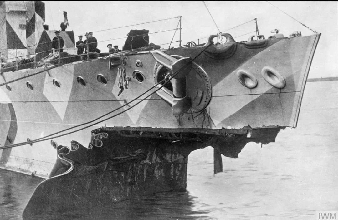 На фото поврежденный в результате тарана ПЛ К 17 легкий крейсер Фирлесс: