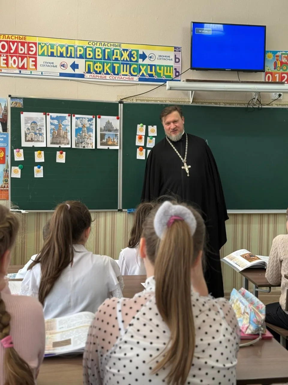 В рамках соглашения о сотрудничестве между Донецкой епархией и Министерством образования ДНР настоятель Свято-Введенского храма, протоиерей Димитрий Чеверда, посетил урок по изучению основ православной культуры в ГБОУ «Школа № 97 городского округа Донецк», пообщался с детьми, ответил на интересующие их вопросы.