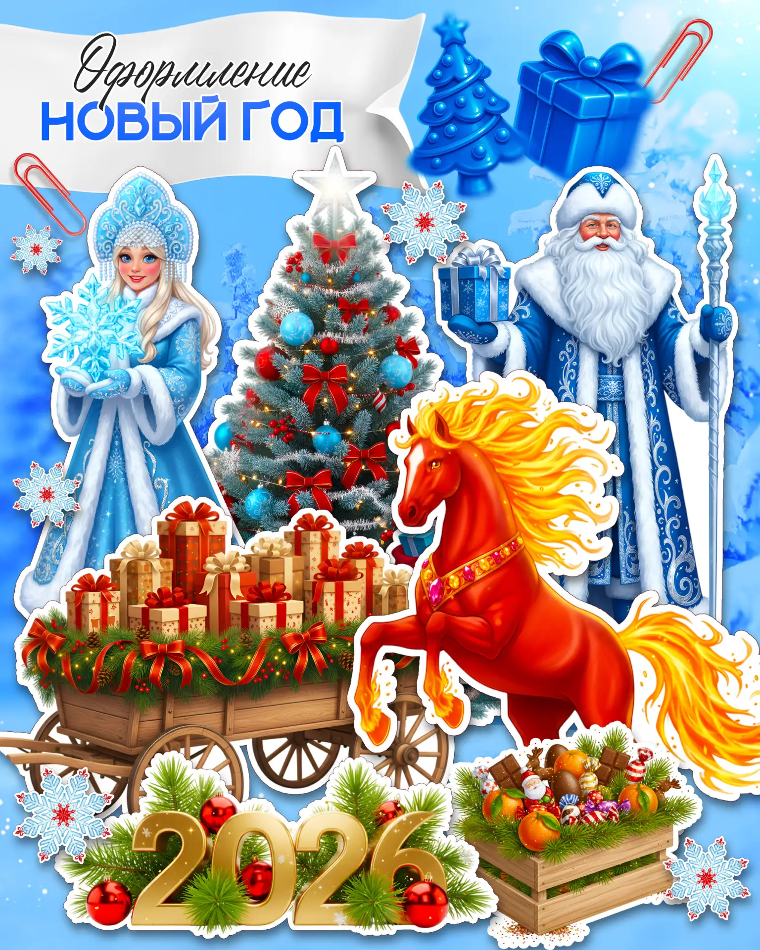 🔹 Дед Мороз, Снегурочка, Лошадь, Тележка с подарками, Ёлочка, Ящик со сладостями, Снежинки, Надпись 2026;